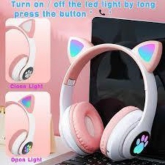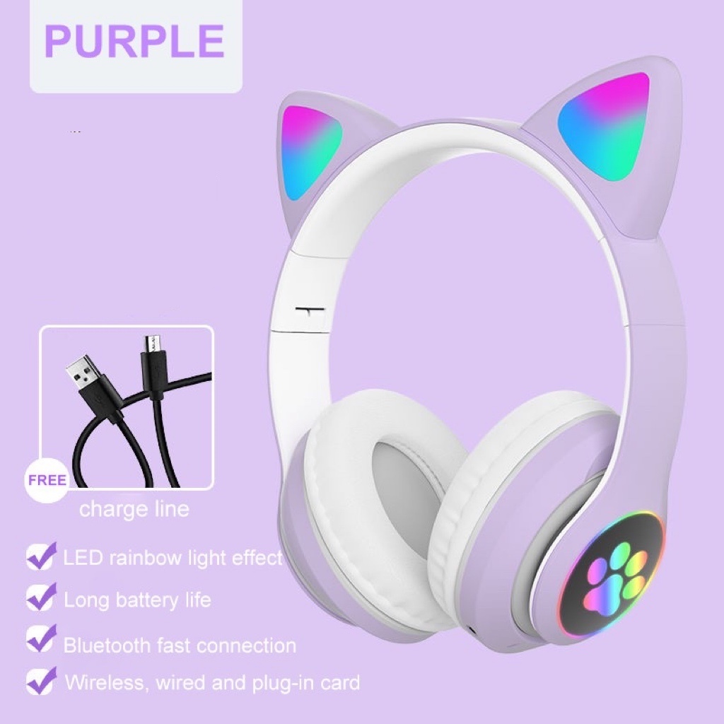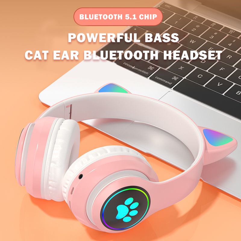 Headset Headphone bluetooth gaming kucing android bass LED Light with Mic/Foldable HiFi Stereo Headset Bluetooth