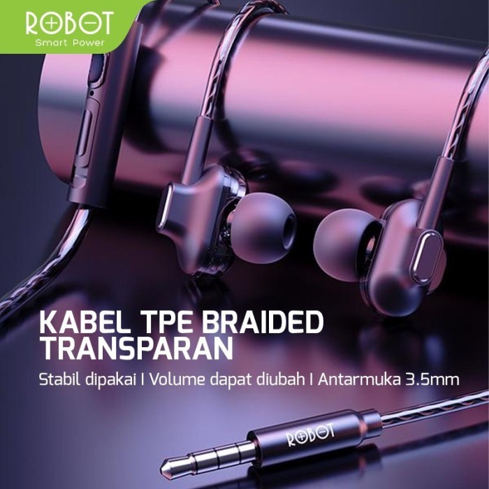 Headset Robot RE30 Wired Earphone Bass Android iPhone Original - Hitam