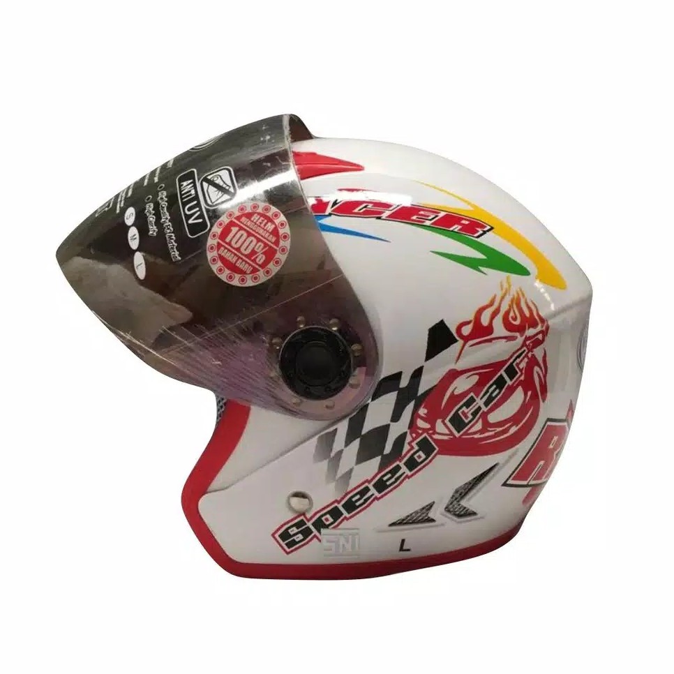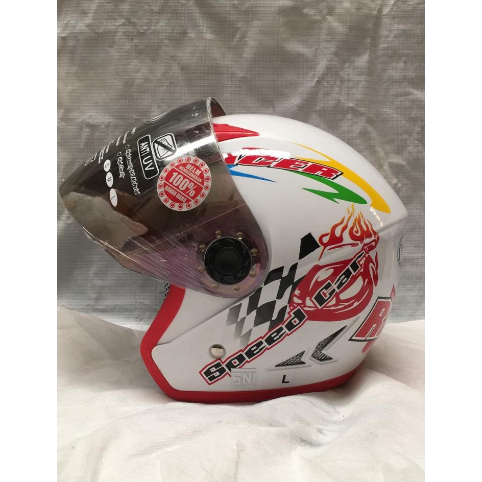 Helm Half Face Anak Kidzu Racer White Red (Kaca Rainbow)