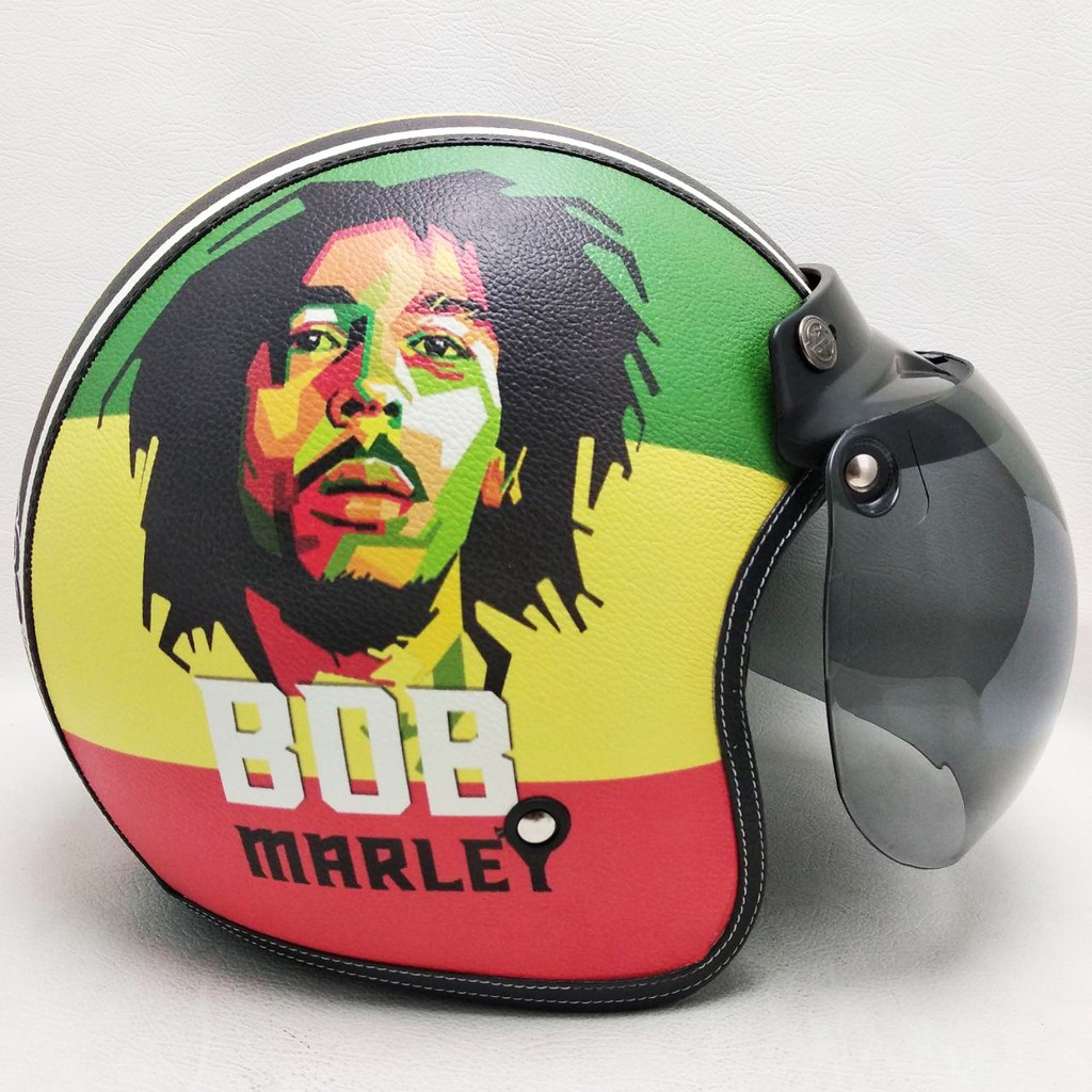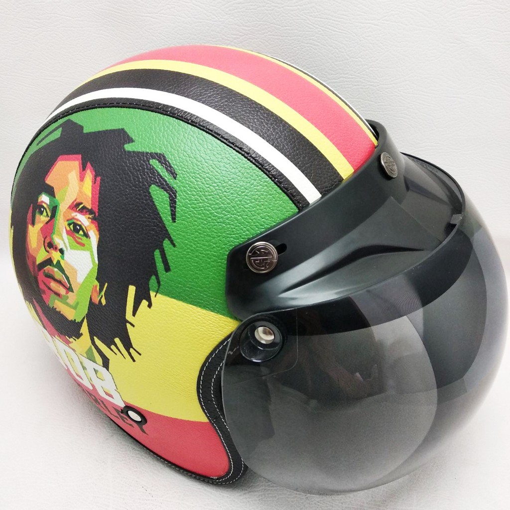Helm Retro bogo Kulit Motif Rasta Mania Bob Marley Kaca Bubble halfface