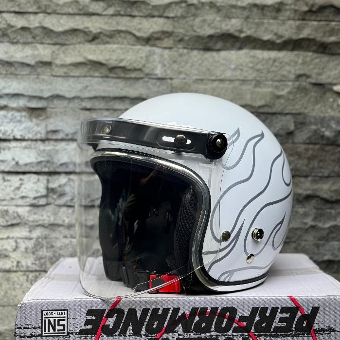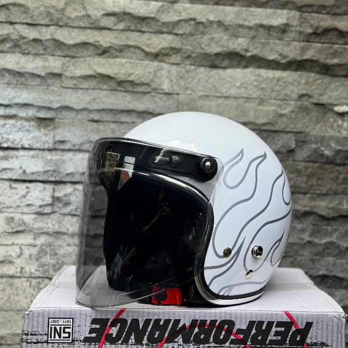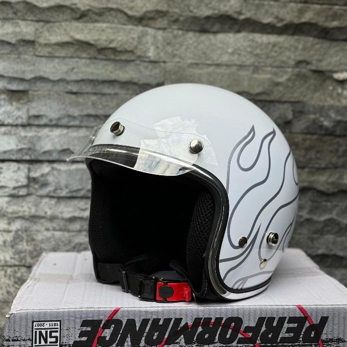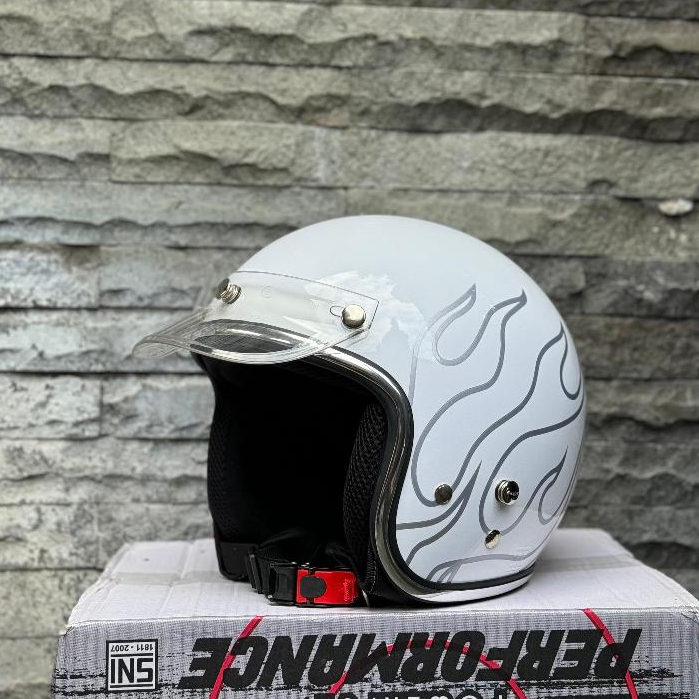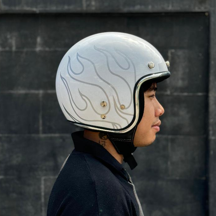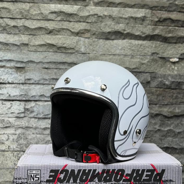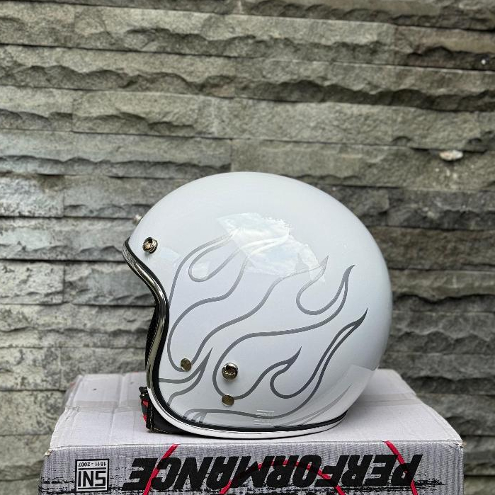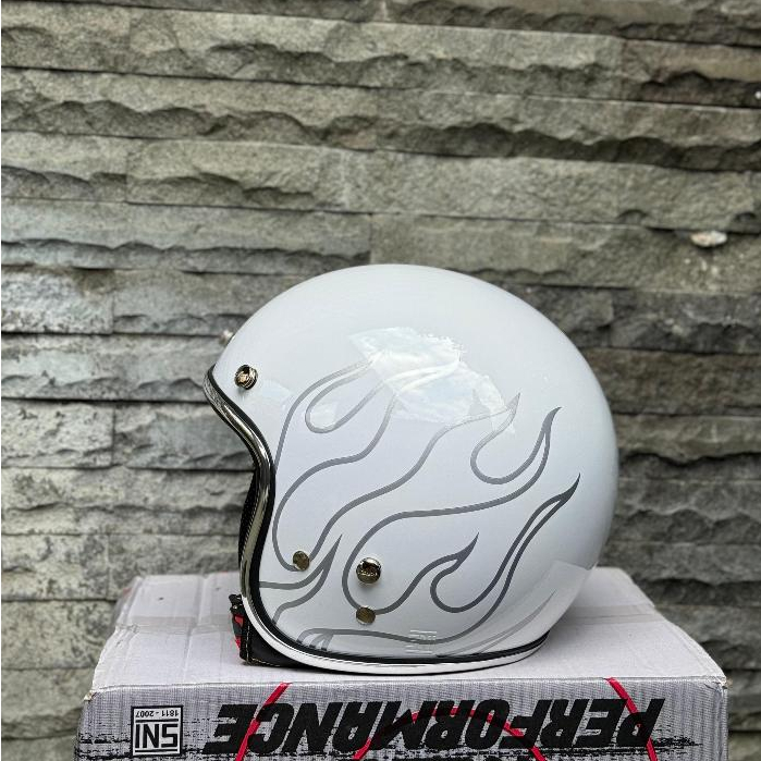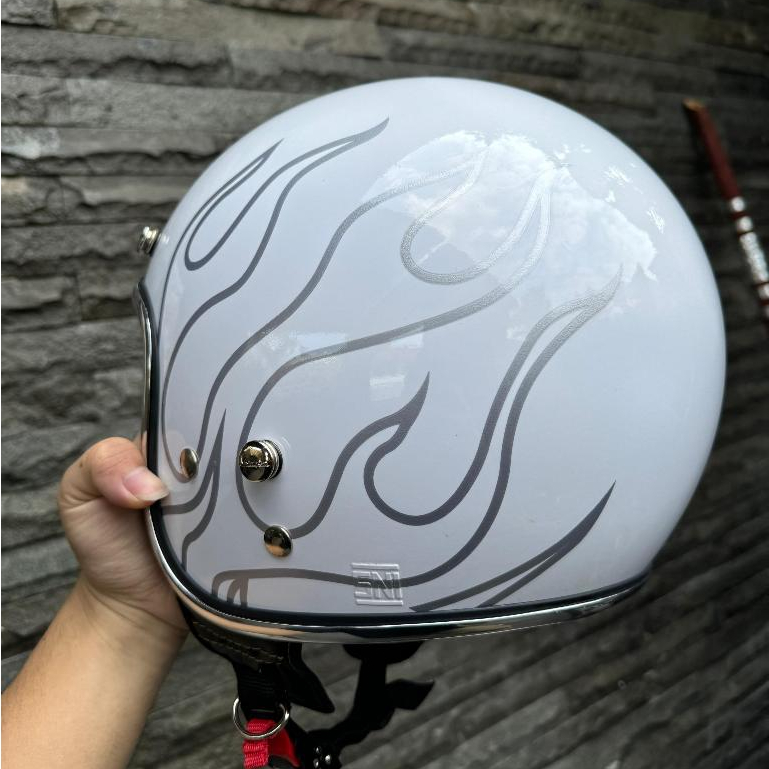 Helm Vespa Bogo SNI Custom Api White Flame List Chrome