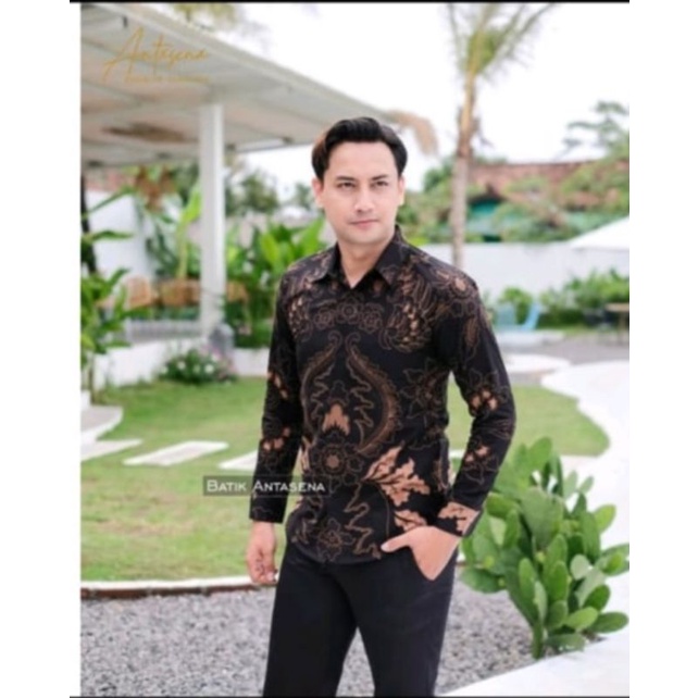 Hem Atasan Kemeja Baju Batik Pria Cowok Laki Laki Slimfit Full Lapis Furing Motif Bunga Mahkota Coklat Lengan Panjang Modern