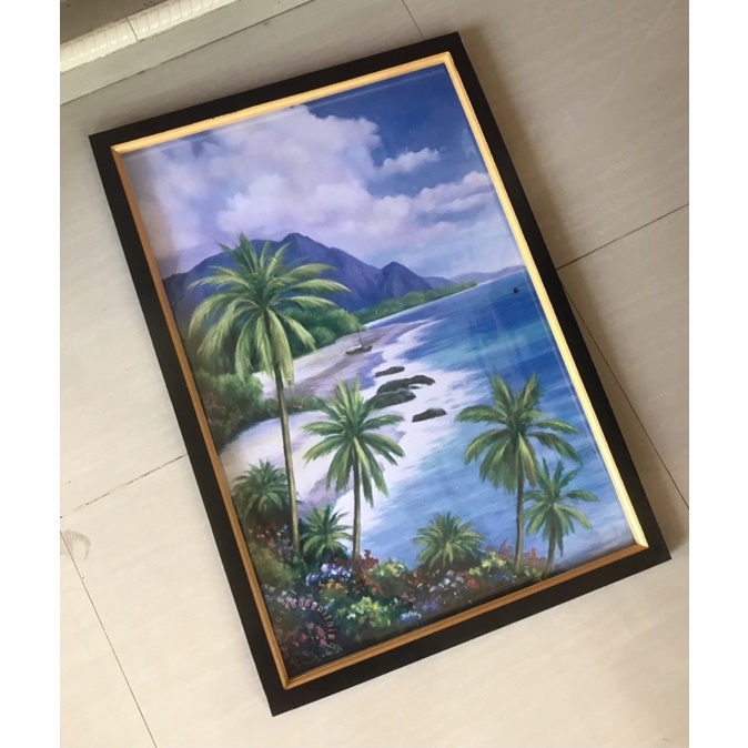 Hiasan Dinding Cetak Gambar Lukisan Pemandangan Alam Gunung Pohon kelapa Di tepi pantai plus Bingkai ukuran 52cm x 35cm