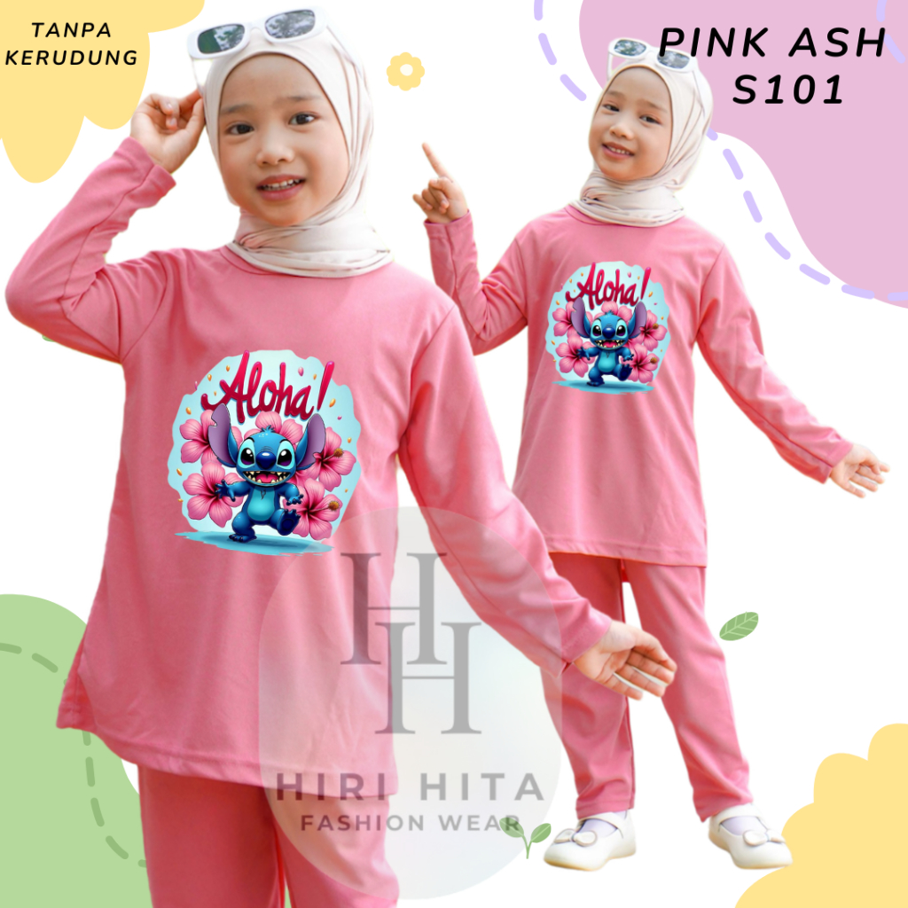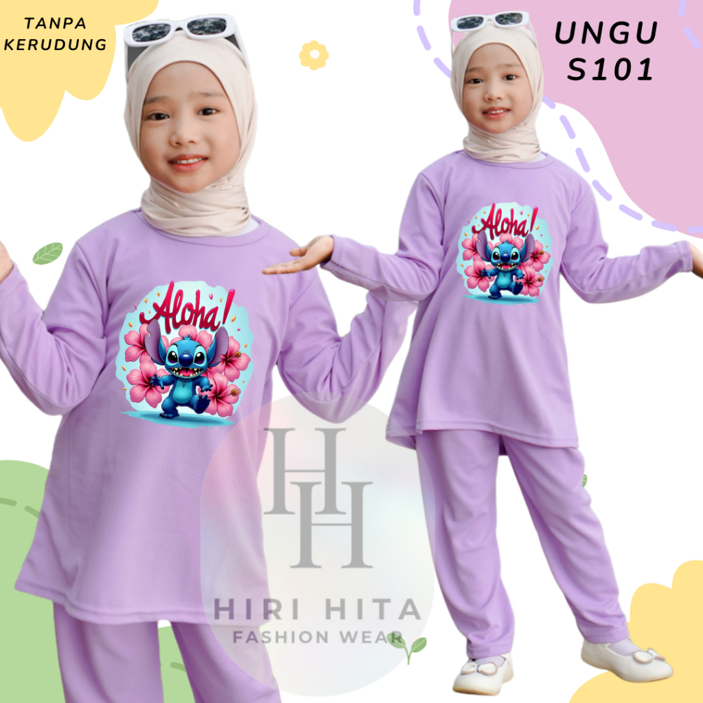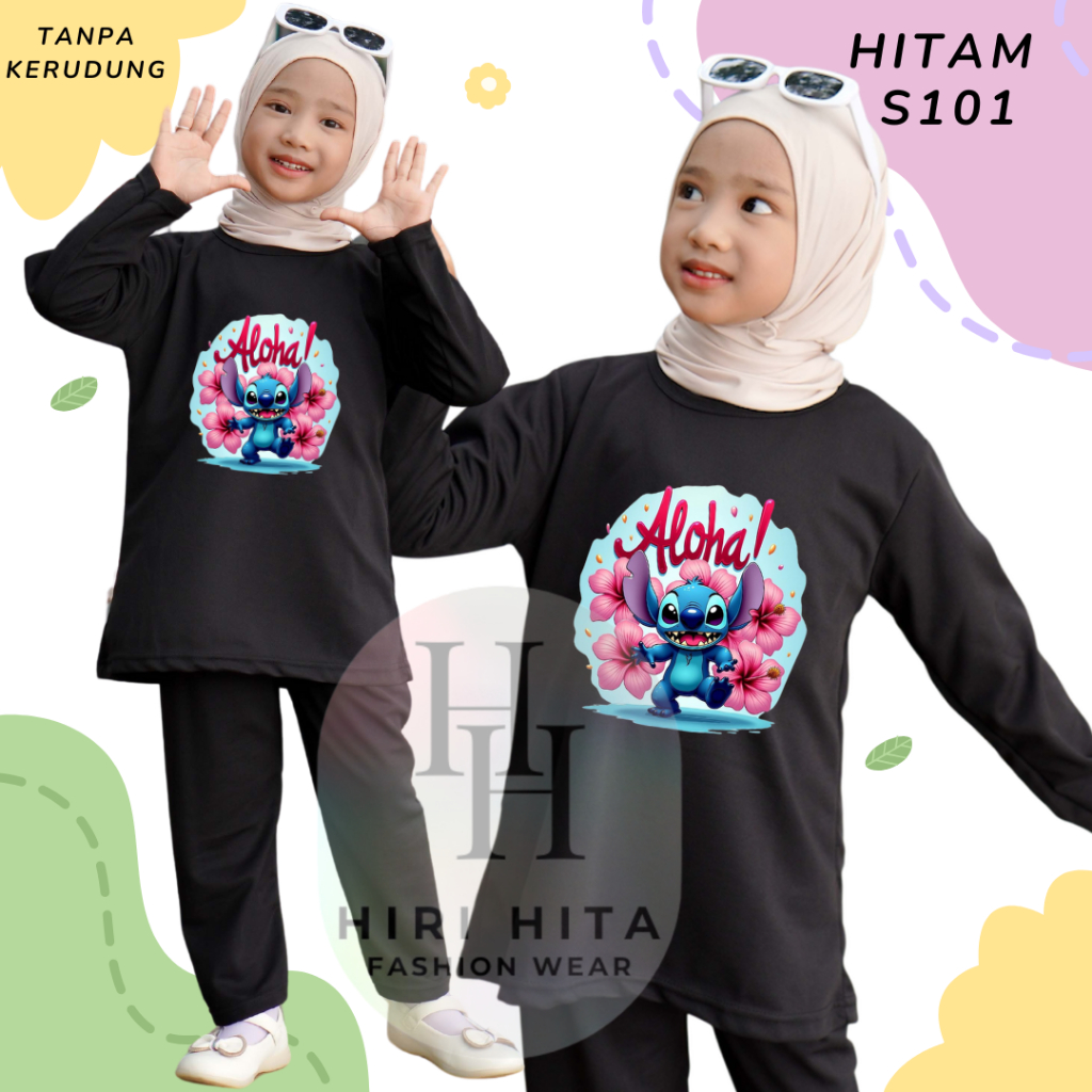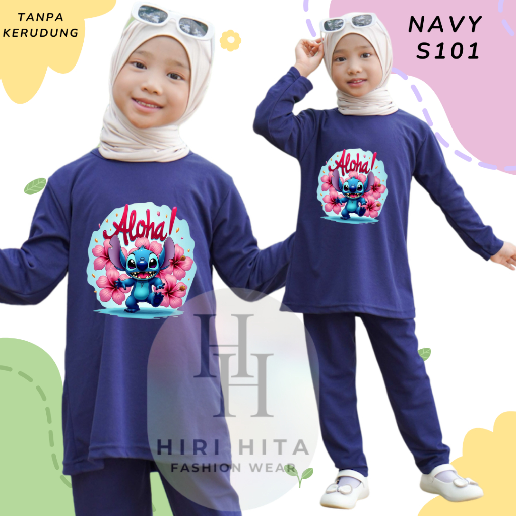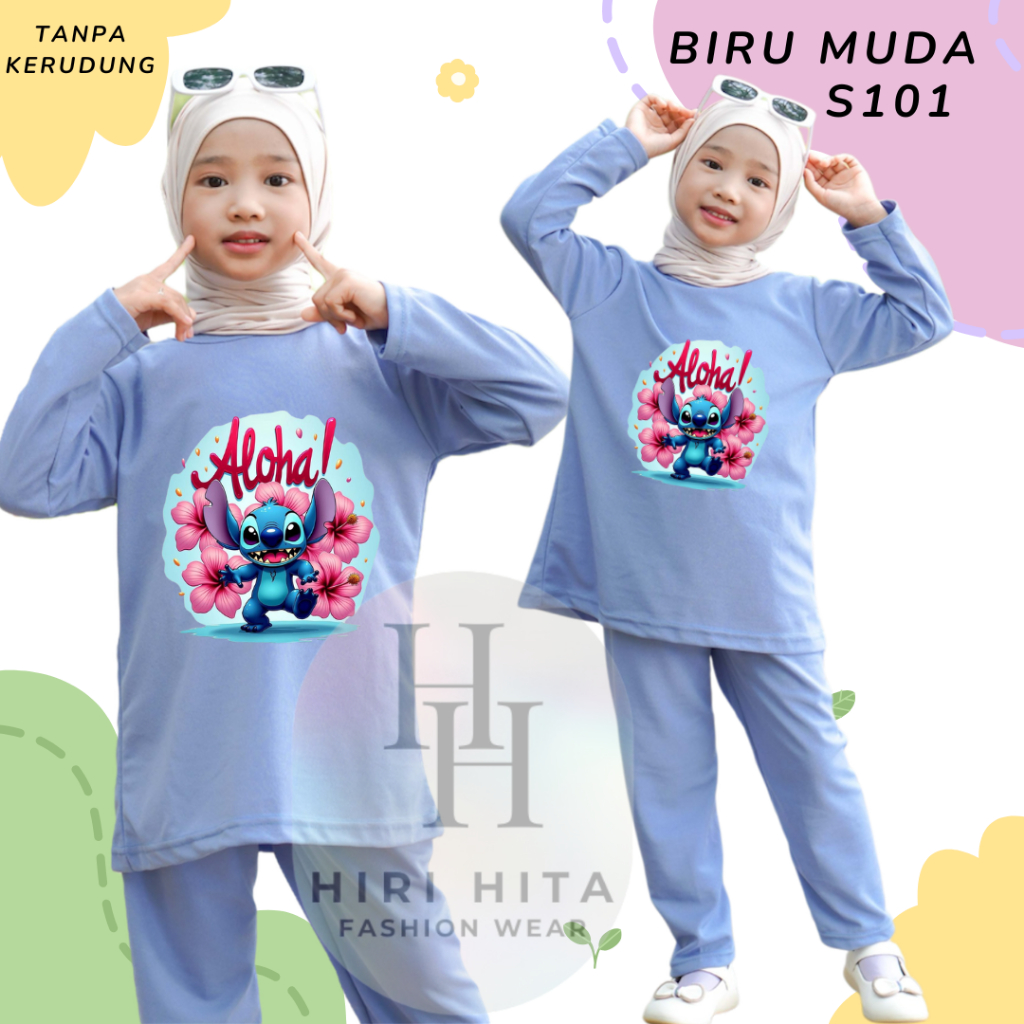 Hirihita S101 Setelan Muslim Tunik One Set Panjang Merah Putih Anak Cewek Lilo Stich Alien Biru