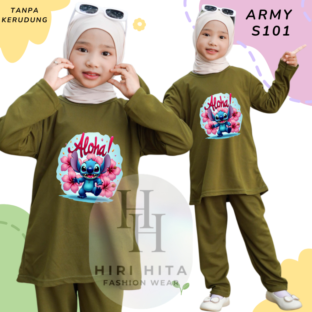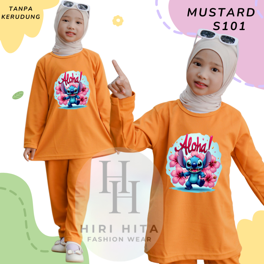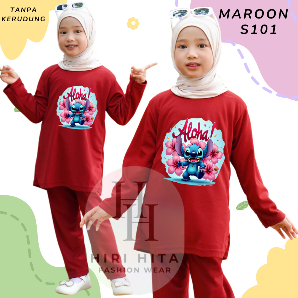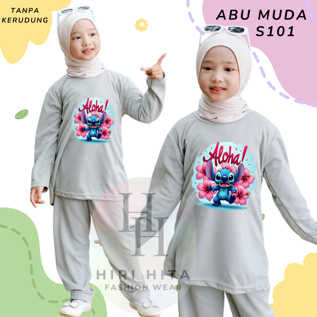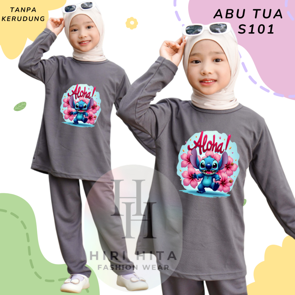 Hirihita S101 Setelan Muslim Tunik One Set Panjang Merah Putih Anak Cewek Lilo Stich Alien Biru