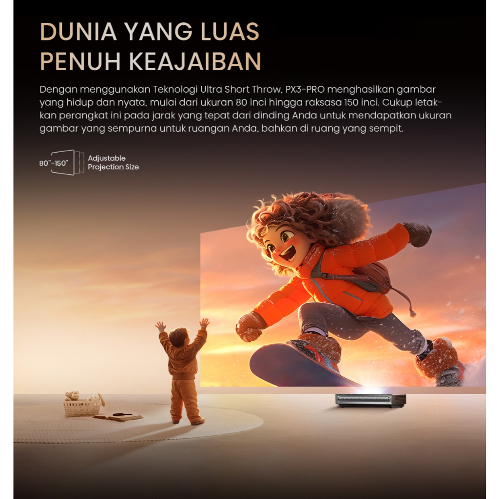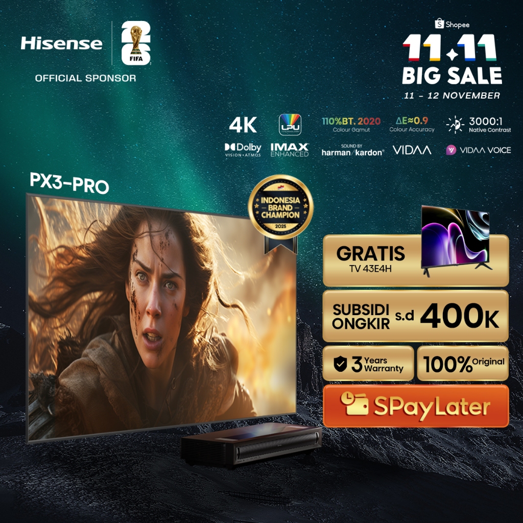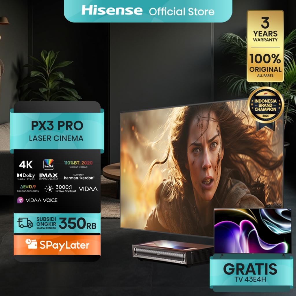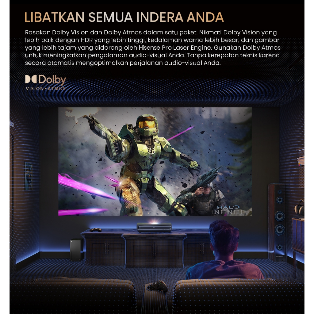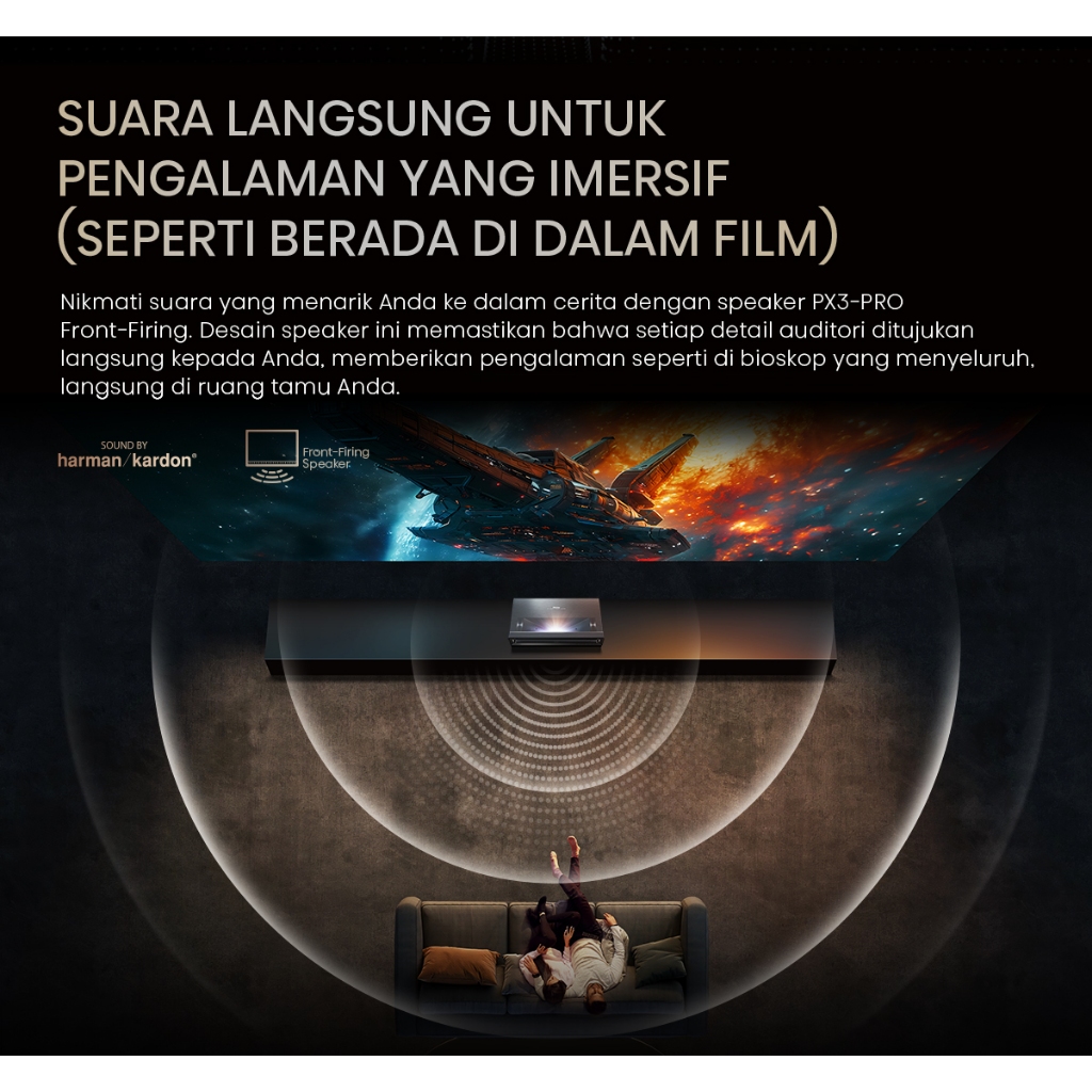(BELI TV GRATIS TV) Hisense TV PX3-PRO Vidaa Laser TV 120 inch LPU Laser Engine Ultra Short Throw Technology 4K UI Upscaler AI Computing 3000 Lumen Brightness Dolby Vision & Atmos Harman Kardon Sound Television