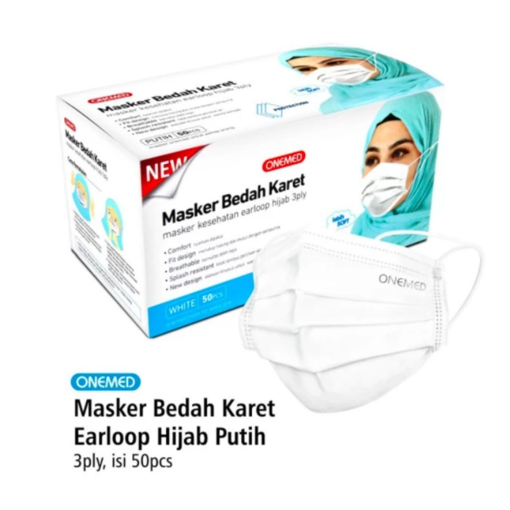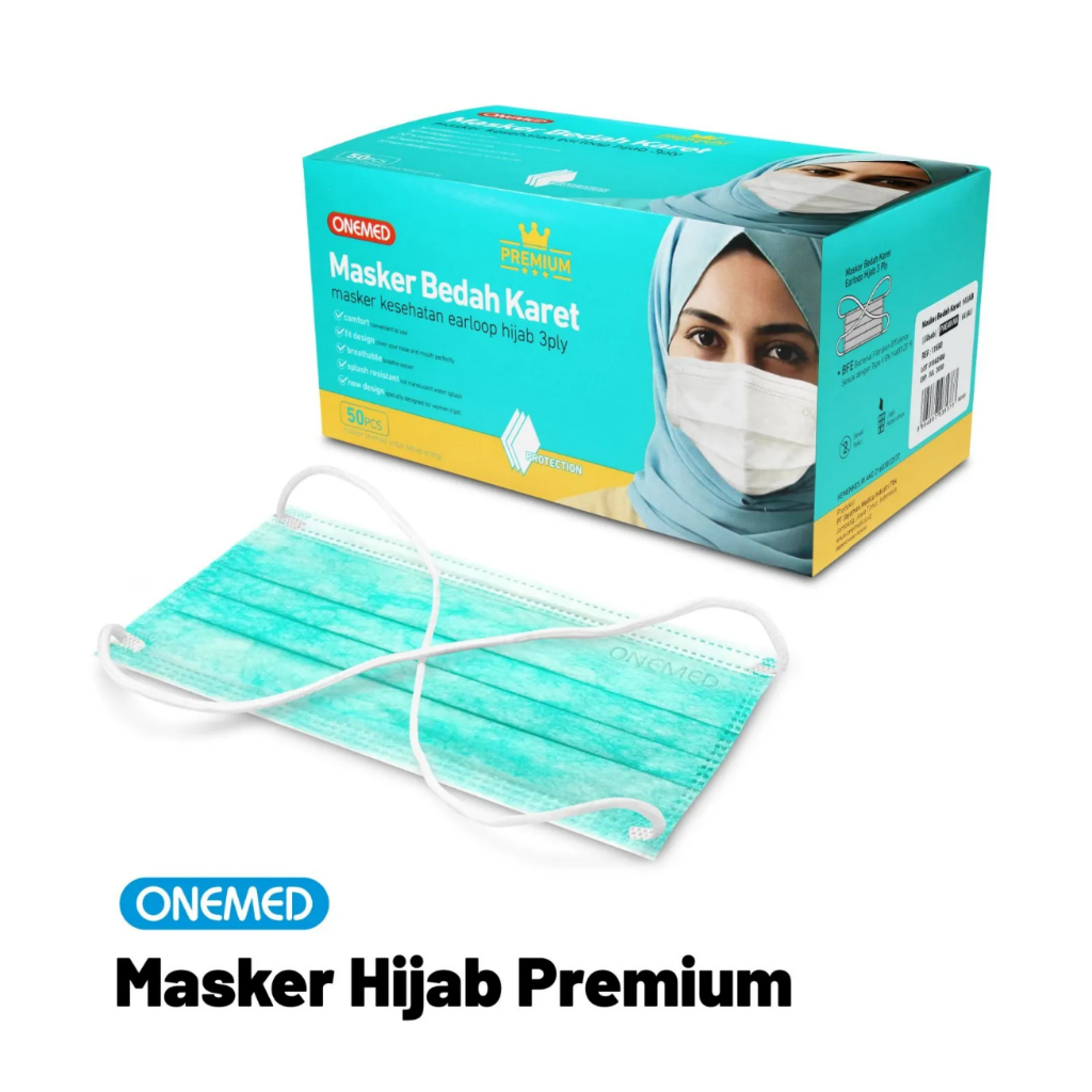 Masker Hijab Onemed / Headloop 3Ply Premium 1BOX Isi 50Pcs Masker Hijab Medis Warna Putih Hijau