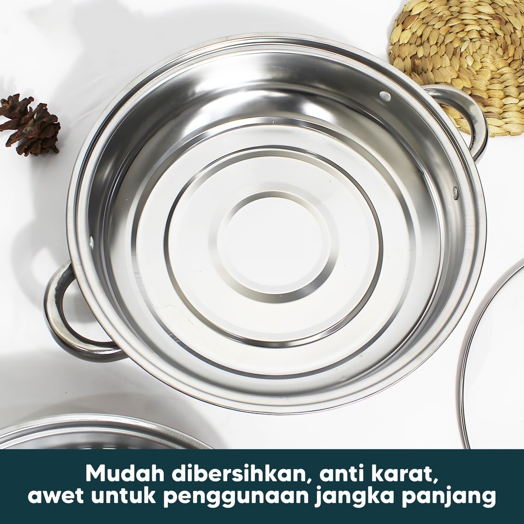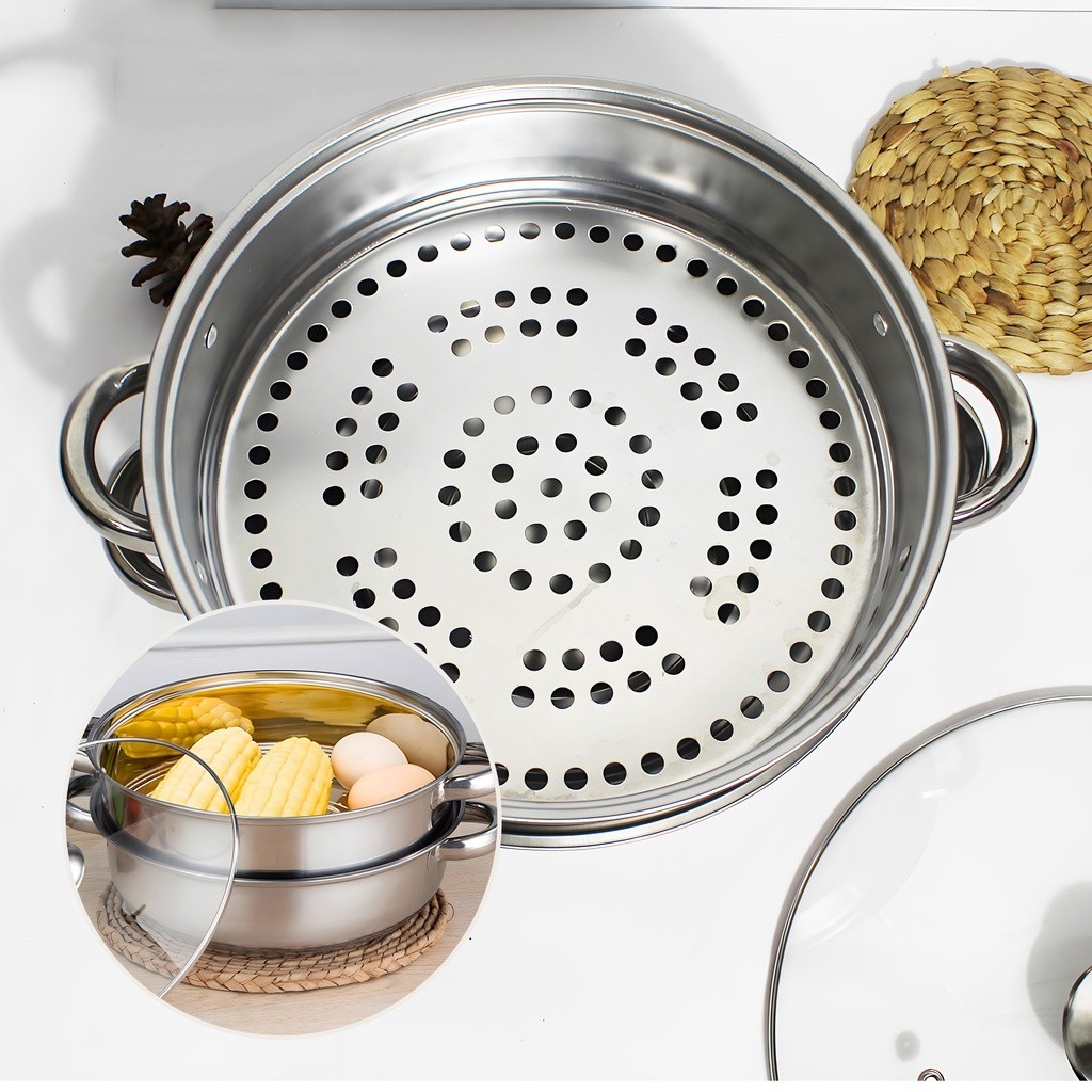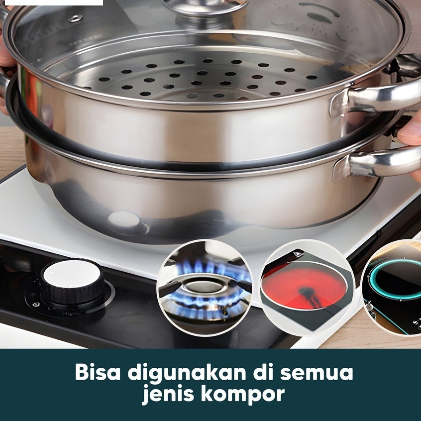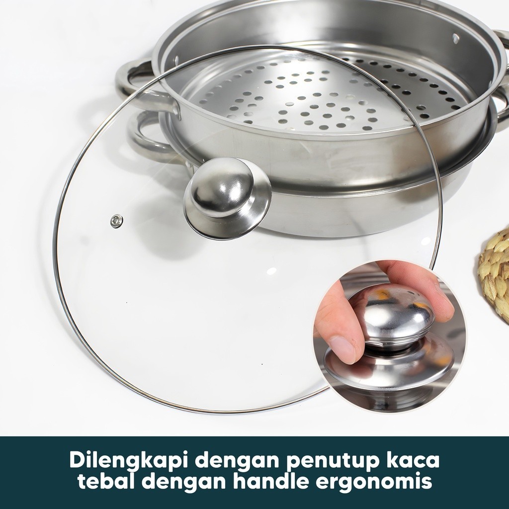 PANCI KUKUS 2 TINGKAT TUTUP KACA STEAMER STAINLESS STELL Dandang kukusan Gratis Ongkir -jMS