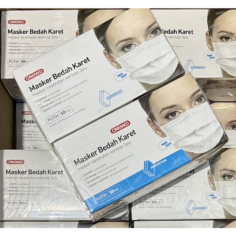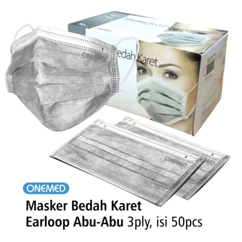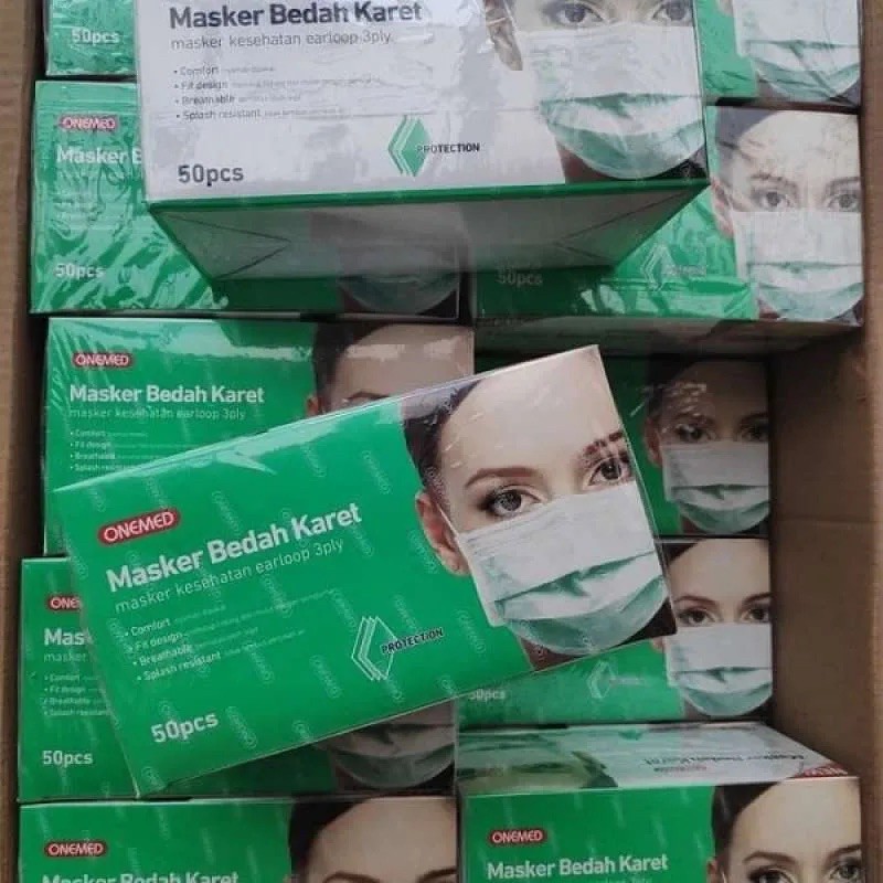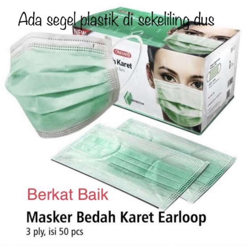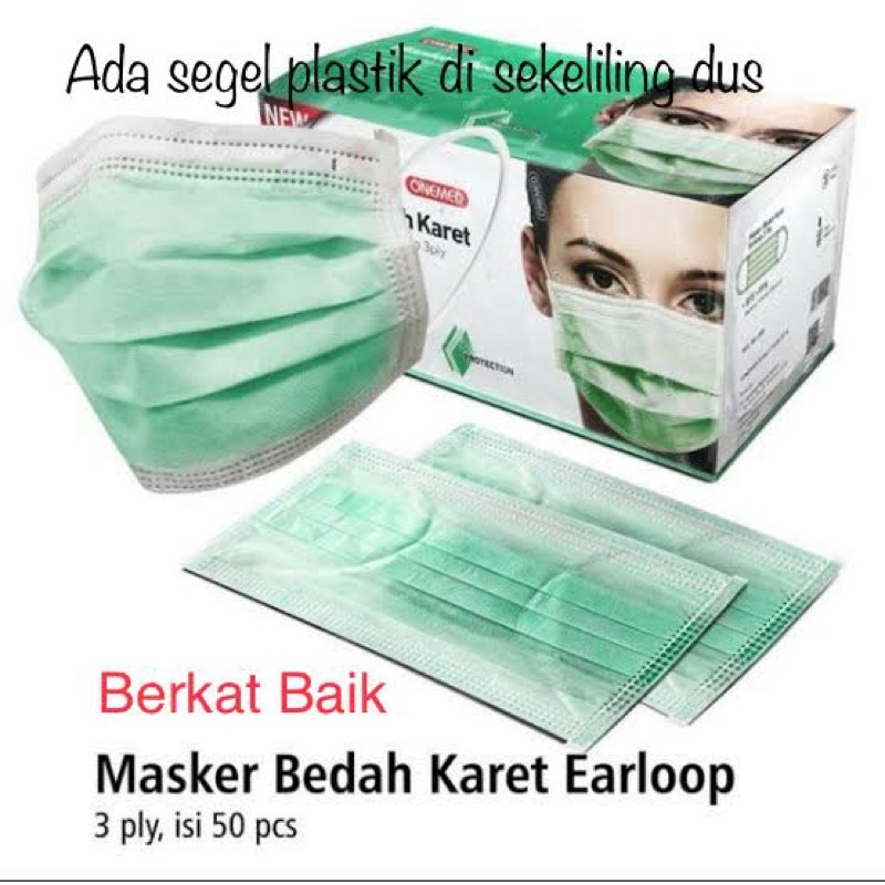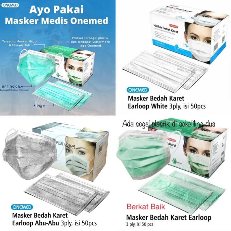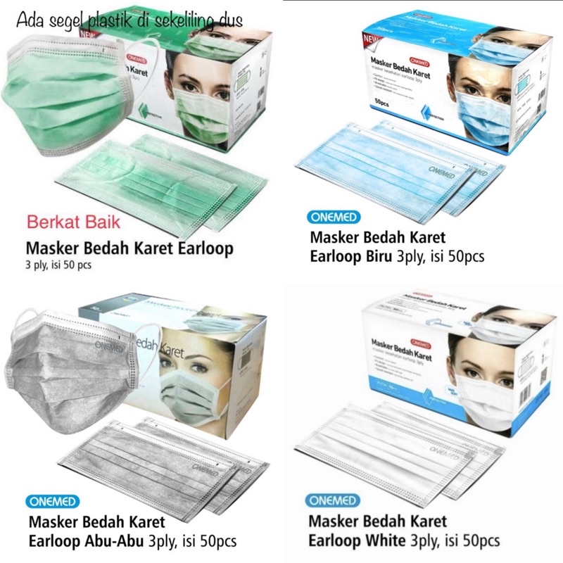 Onemed Masker Bedah Karet Earloop 3 Ply isi 50 pcs / Box Kemasan Baru Original Hijau Putih Abu Abu Segel Plastik