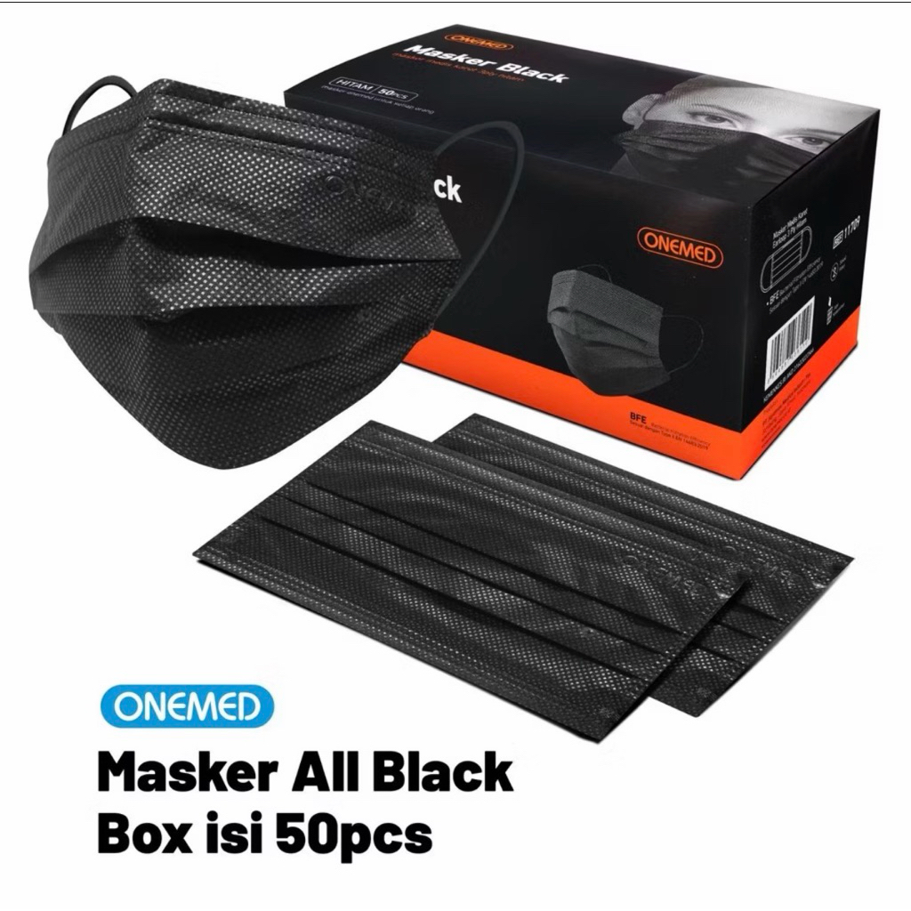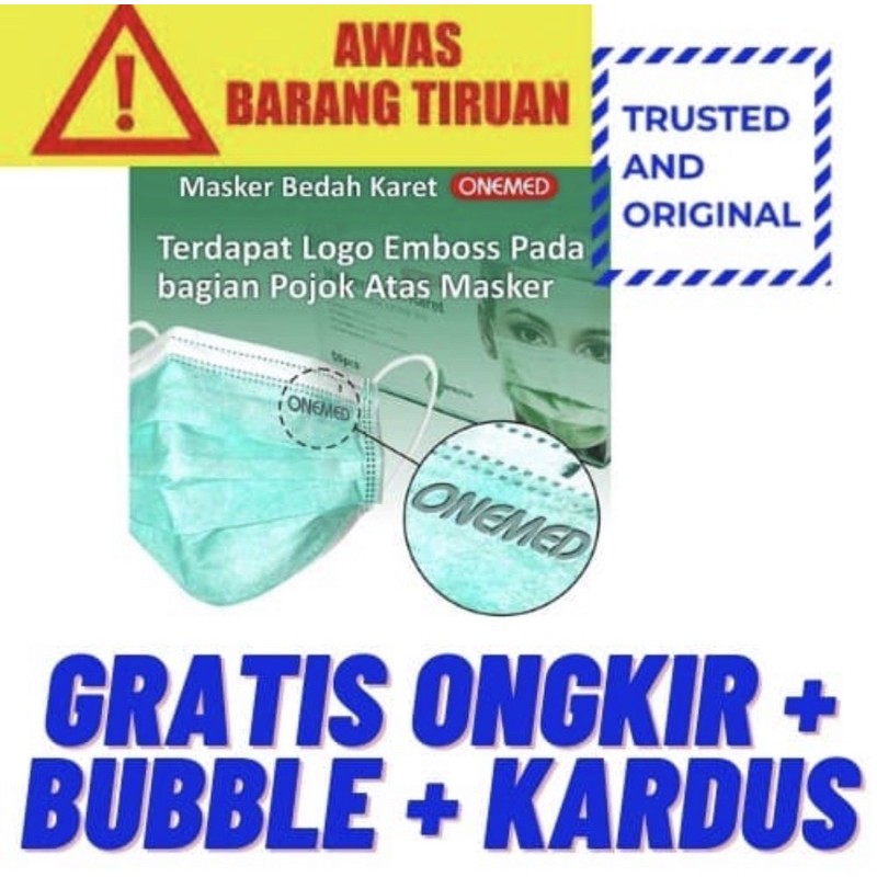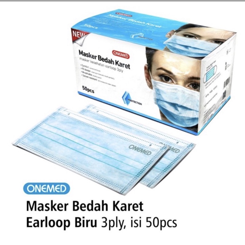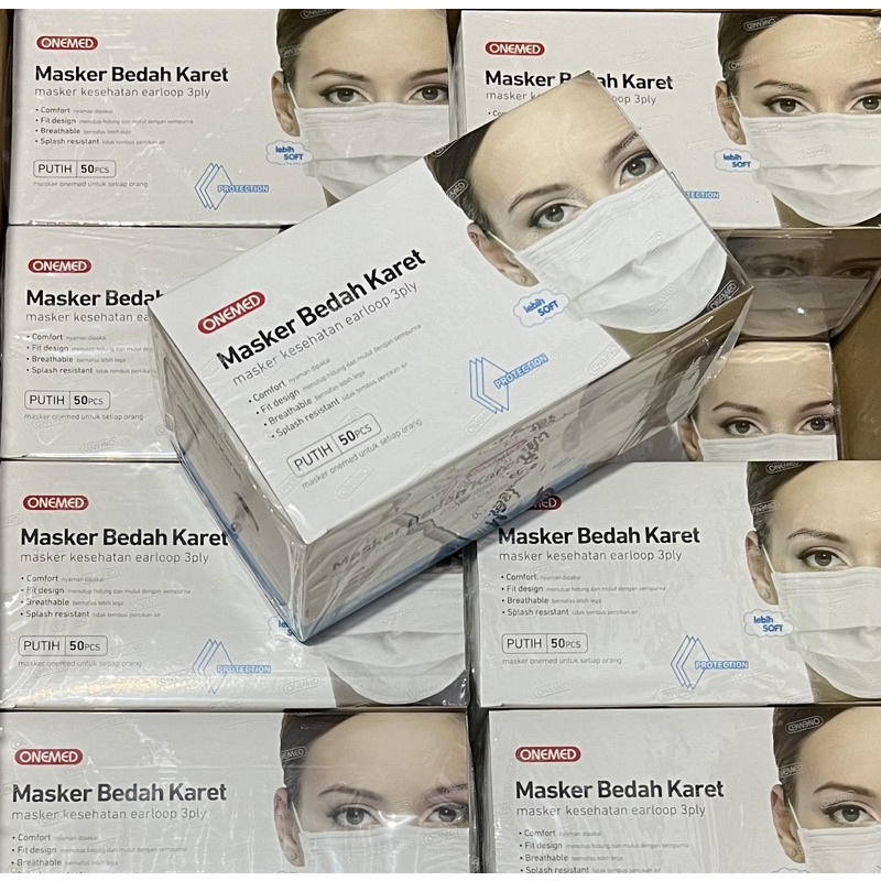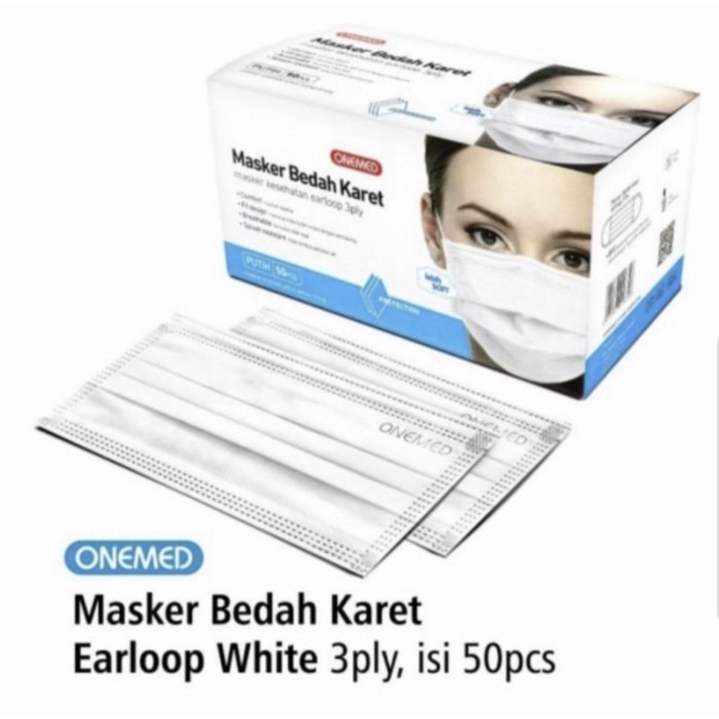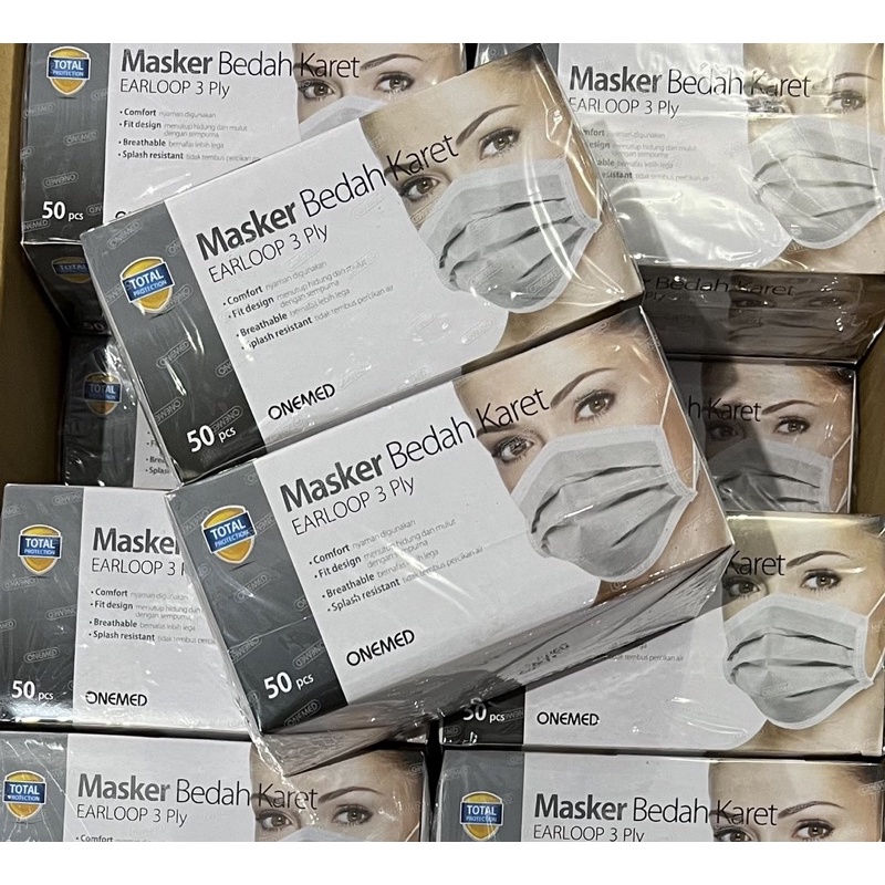 Onemed Masker Bedah Karet Earloop 3 Ply isi 50 pcs / Box Kemasan Baru Original Hijau Putih Abu Abu Segel Plastik