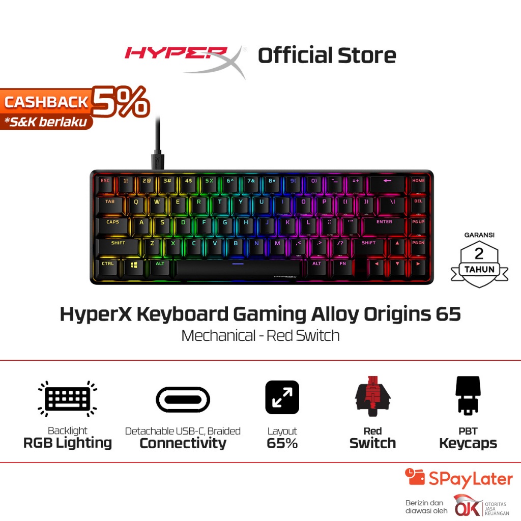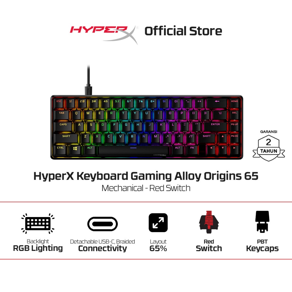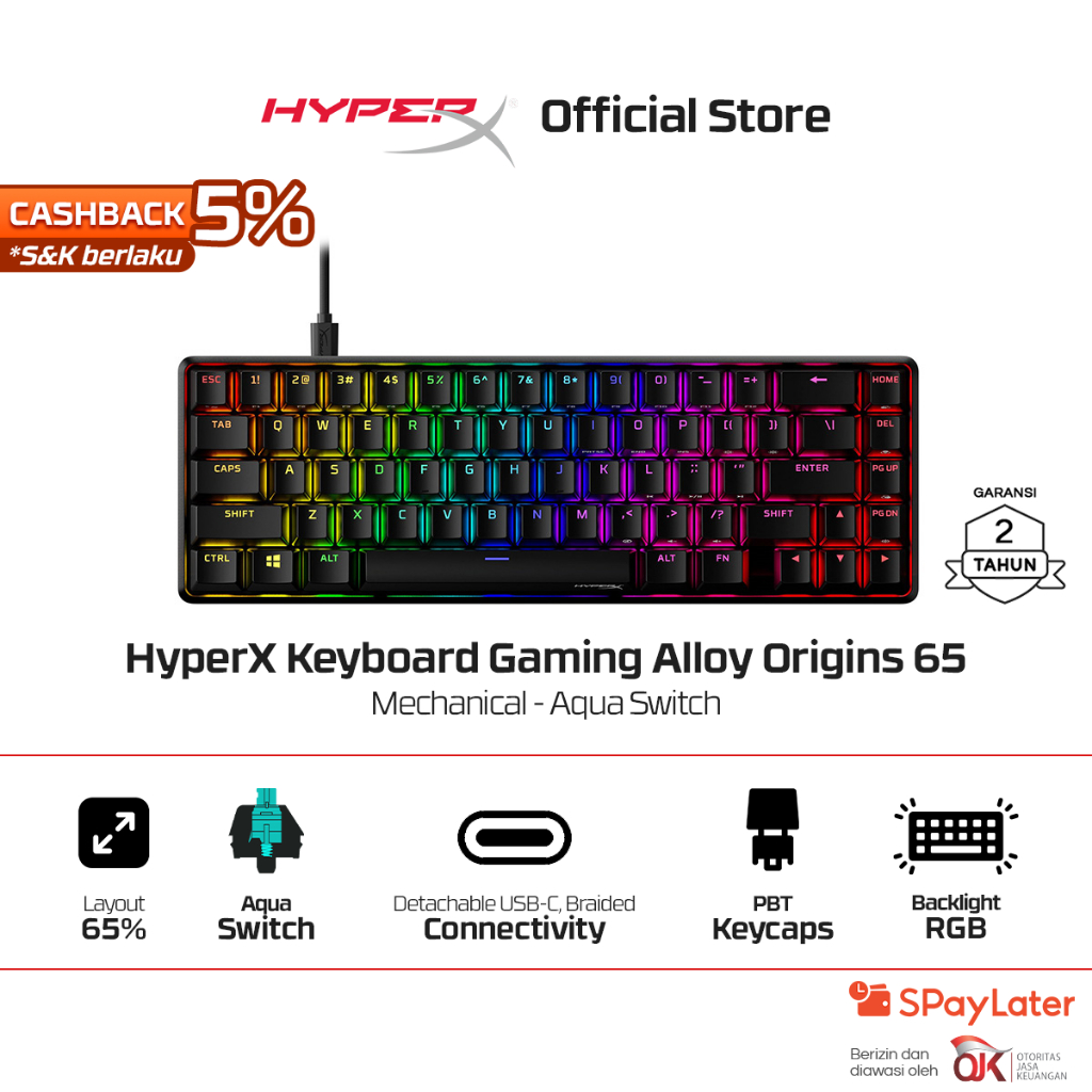 HyperX Keyboard Gaming Alloy Origins 65 65% Compact Wired Red / Aqua Mechanical Switch Aluminium PBT Keycaps RGB LED Small Size Free Keycap Puller Alumunium Promo Cicilan Ringan Non Wireless Non Hotswap