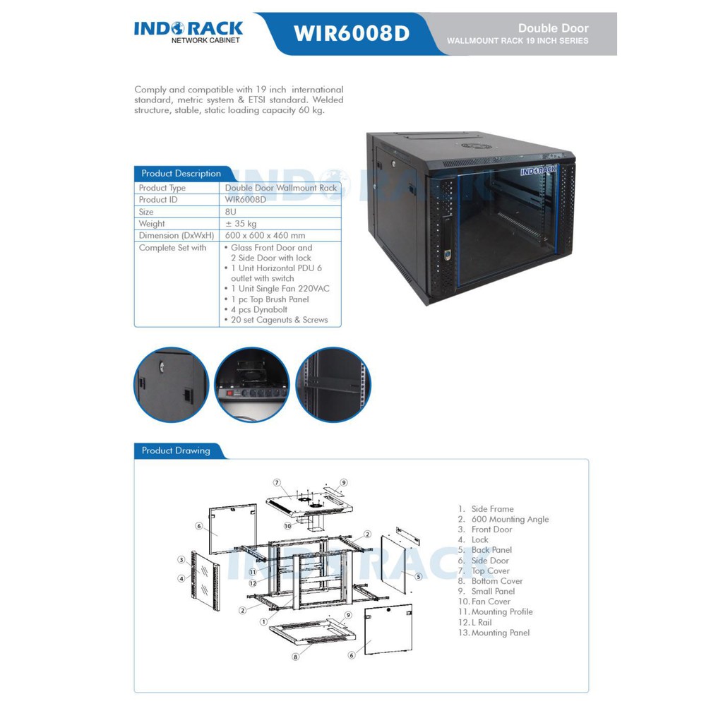 INDORACK WALLMOUNT 8U DEPTH 600MM DOUBLE DOOR - WIR6008D GLASS DOOR