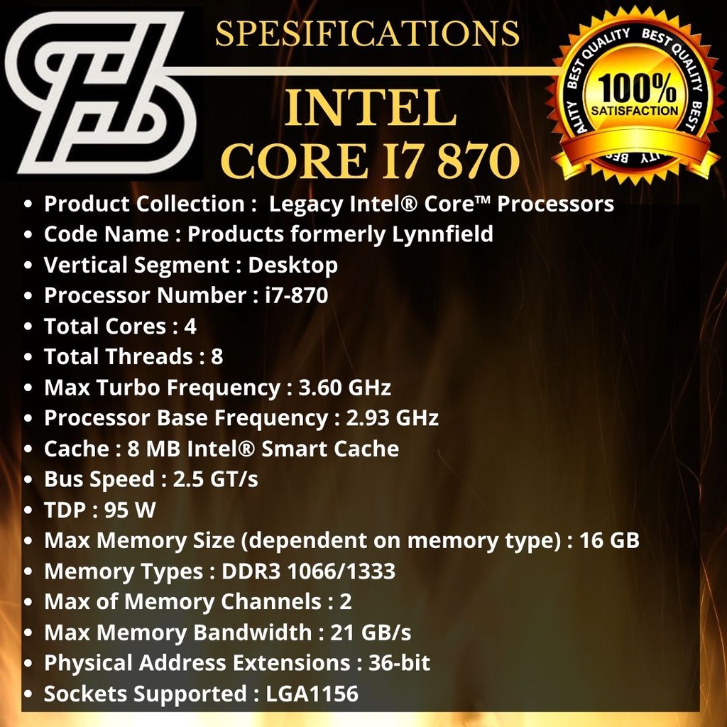 INTEL CORE I7 870 - 2.93GHz UP TO 3.6GHz. LGA 1156. 4 Cores 8Threads. TDP 95W. Processor BEST QUALITY SELECTED PRODUCT