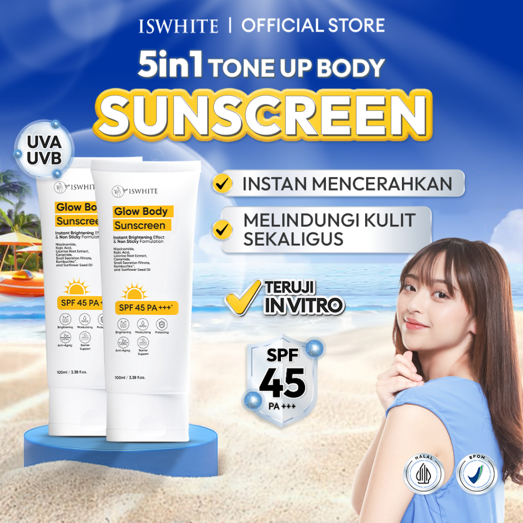 [ INSTAN TONE UP SUNSCREEN SPF ] ISWHITE Glow Body Sunscreen Body lotion SPF 45 PA+++ 100ml - Instan Tone Up Body Sunscreen Hybrid Sunscreen Badan Body SPF Sun Screen Sunblock Badan Tone Up Cream Body Whitening Body Brightening Sunscreen