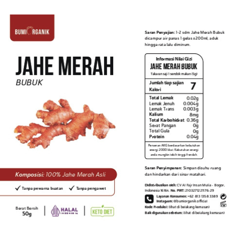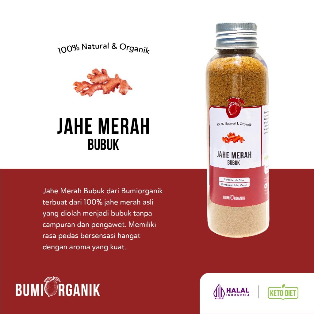 JAHE BUBUK ASLI 100% TANPA CAMPURAN ORIGINAL 50G BUMI ORGANIK / JAHE MERAH BUBUK / BUBUK JAHE MERAH MURNI / WEDANG JAHE REMPAH ASLI / SERBUK JAHE MERAH ORIGINAL / JAHE MERAH INSTAN PURE RED GINGER POWDER / NUTRIFARM BEORGANIK DARI BUMI / SAFIYA / GALLEO