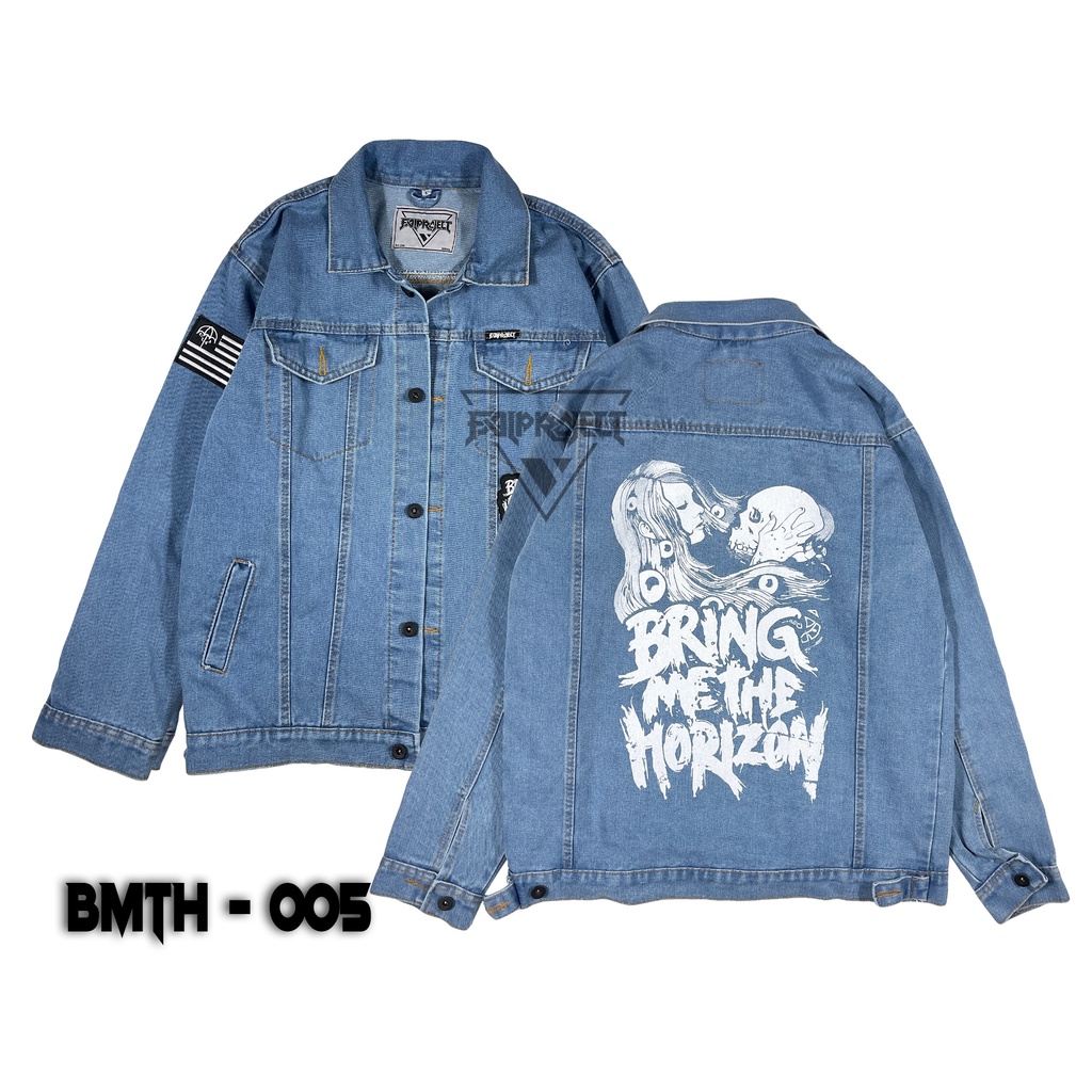 JAKET JEANS SABLON KOLABORASI DENGAN BORDIR MOTIF BAND BRING ME THE HORIZON YANG MENGHASILKAN SUATU JAKET JEANS YANG CASUAL JAKET DENIM JAKETJEANSPRIA
