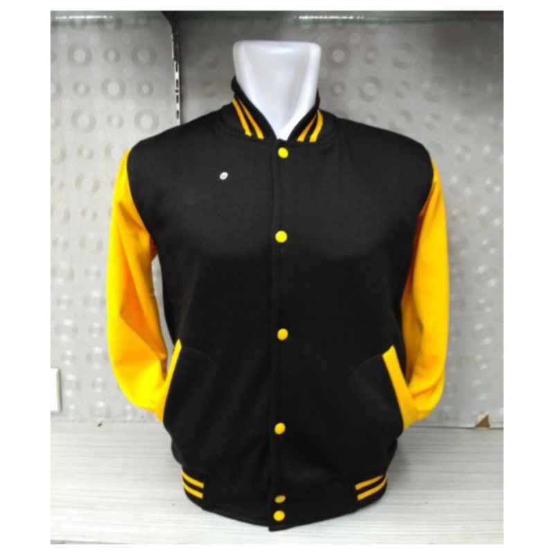 JAKET VARSITY POLOSAN KANCING HITAM KUNING BASEBALL COTTON FLEECE UKURAN M,L,XL,XXL