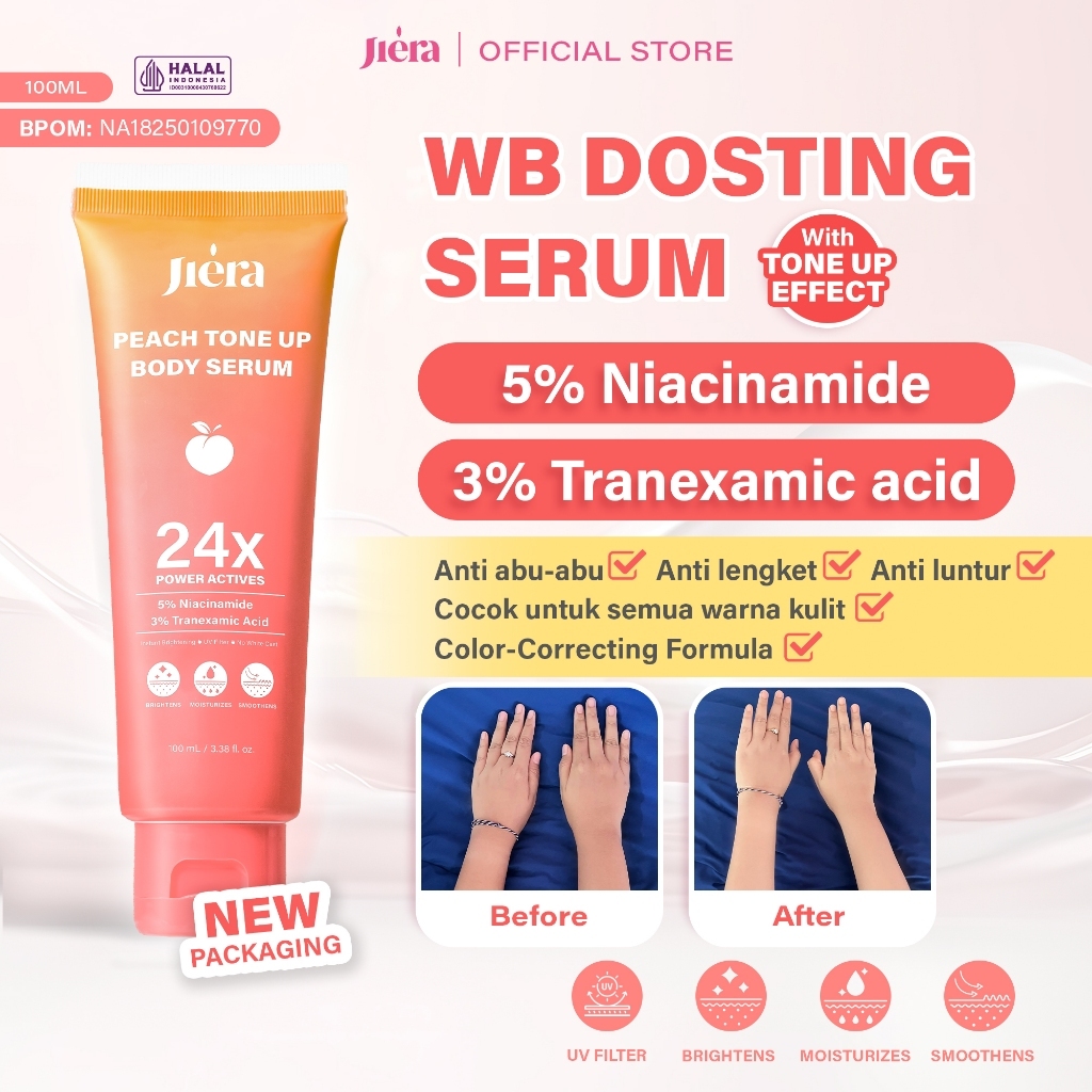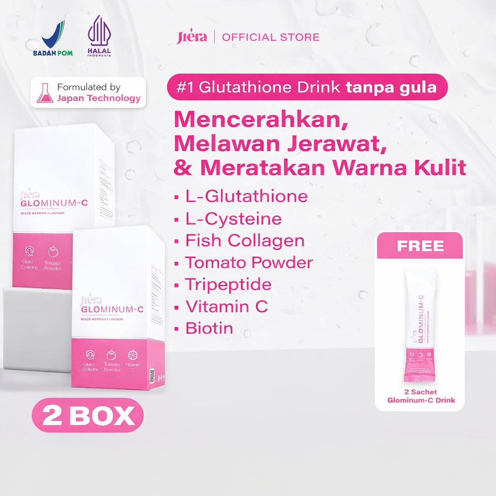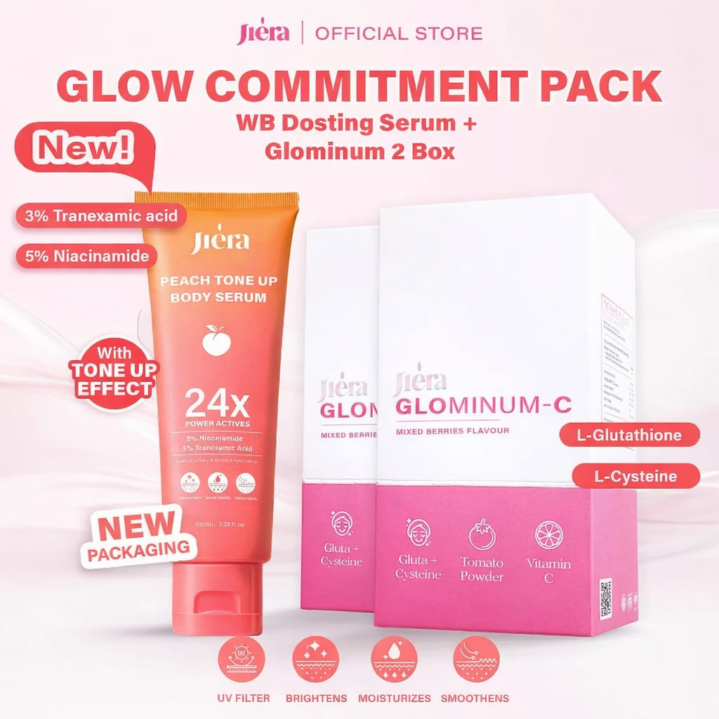 JIERA [PAKET PENCERAH LUAR DALAM] Glominum-C Drink 2 BOX FREE WB Dosting Serum / With Tone Up Effect / Peach Color Correction / 5% Niacinamide 3% Tranexamic Acid / Membantu Mencerahkan Melembutkan Kulit, Menghilangkan Bekas Jerawat