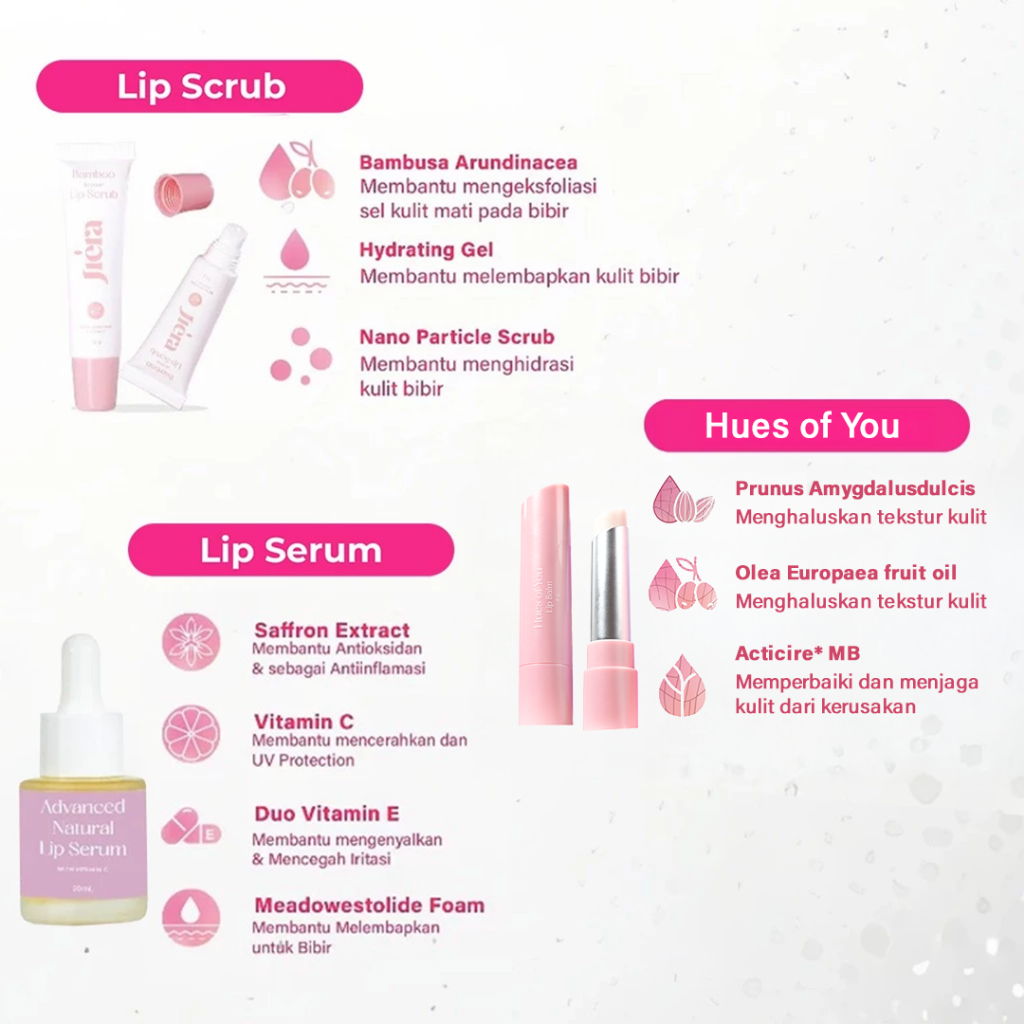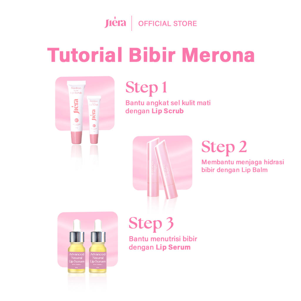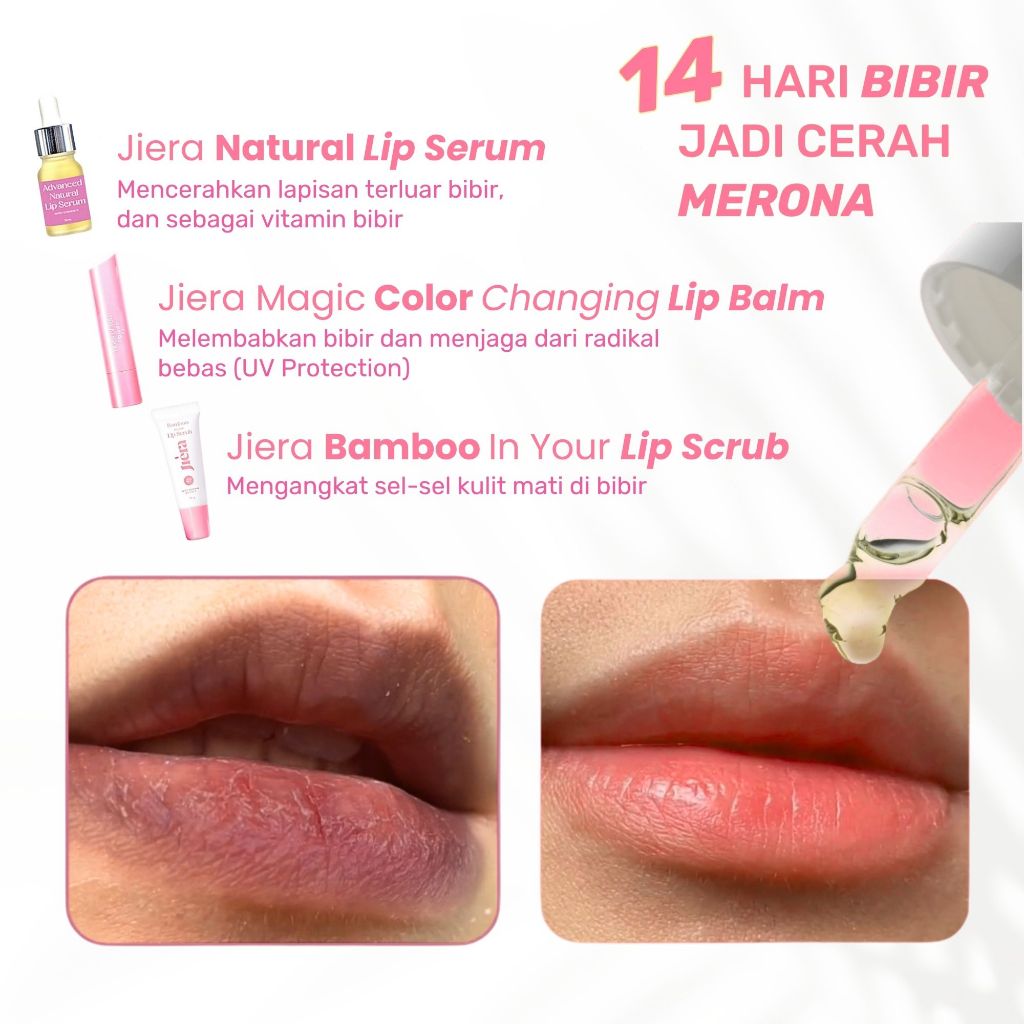 JIERA Triple Brightening Care (Paket Perawatan Bibir Sehat) Membantu Mencerahkan, Melembabkan dan Mengatasi Masalah Bibir Hitam, Pecah-Pecah dan Kusam. Termasuk Lip Serum 10ml, Lip Balm, dan Lip Scrub 10gr. No. BPOM NA18231302052