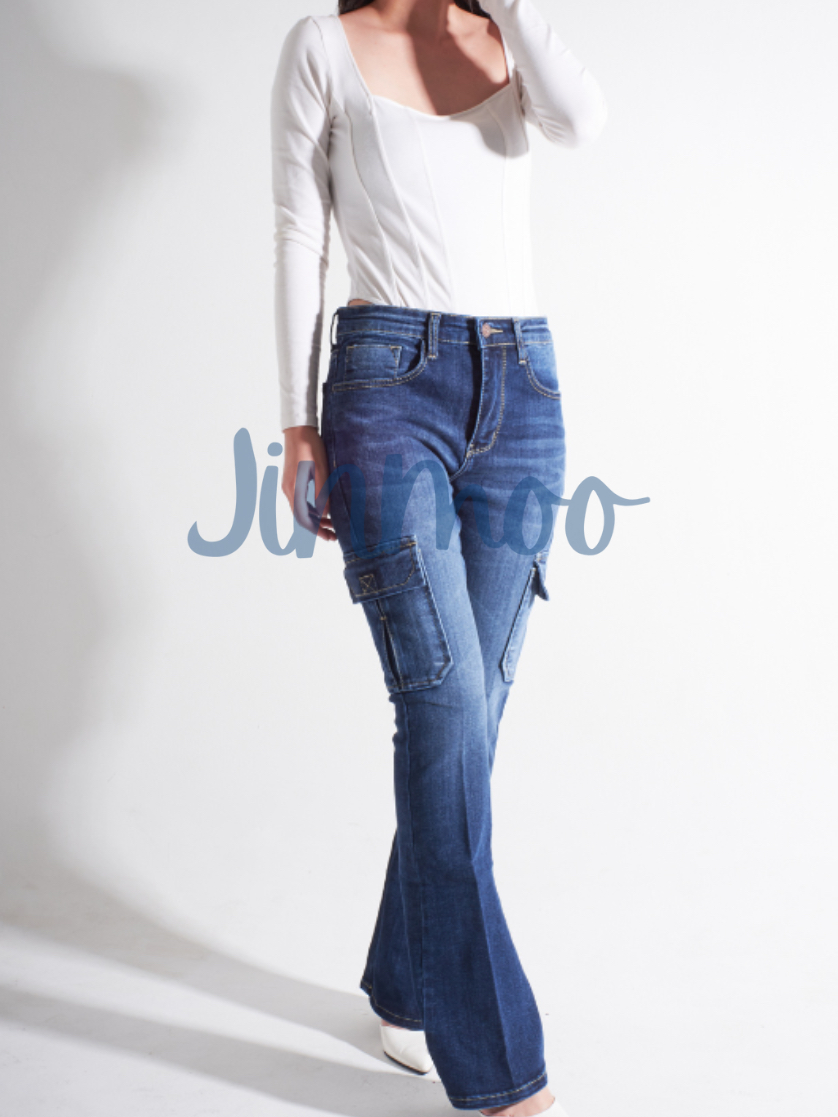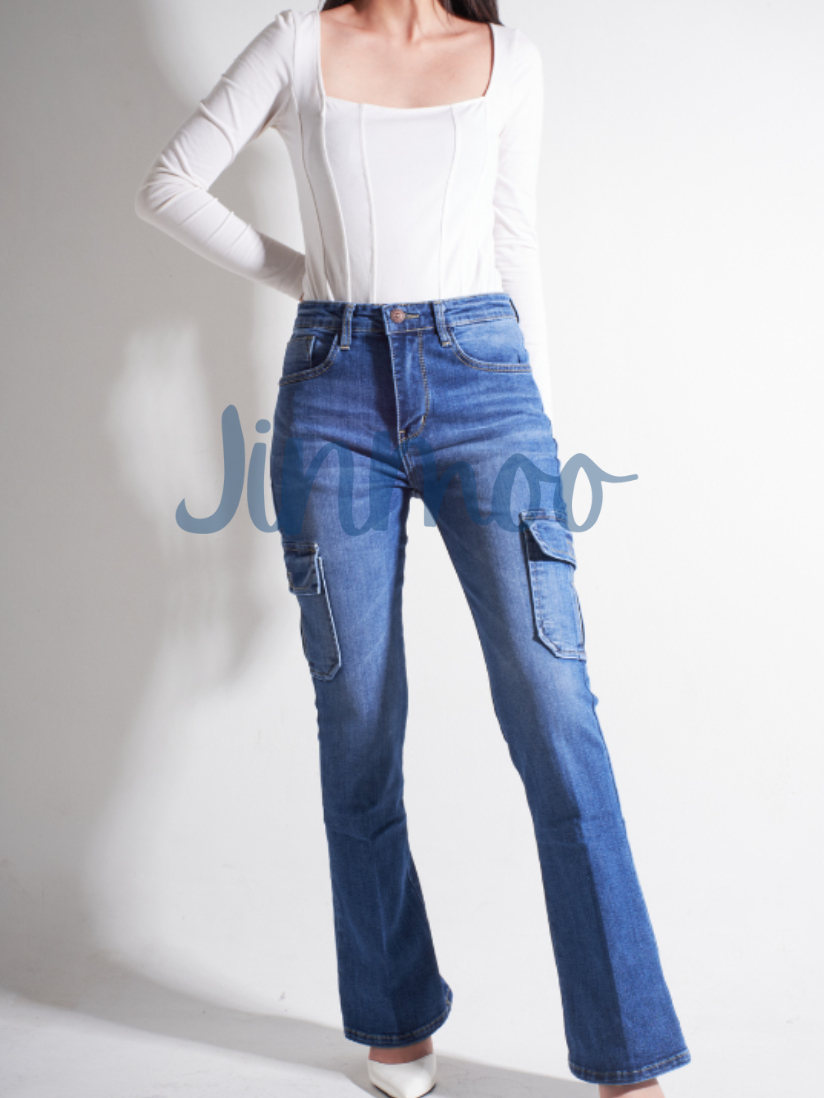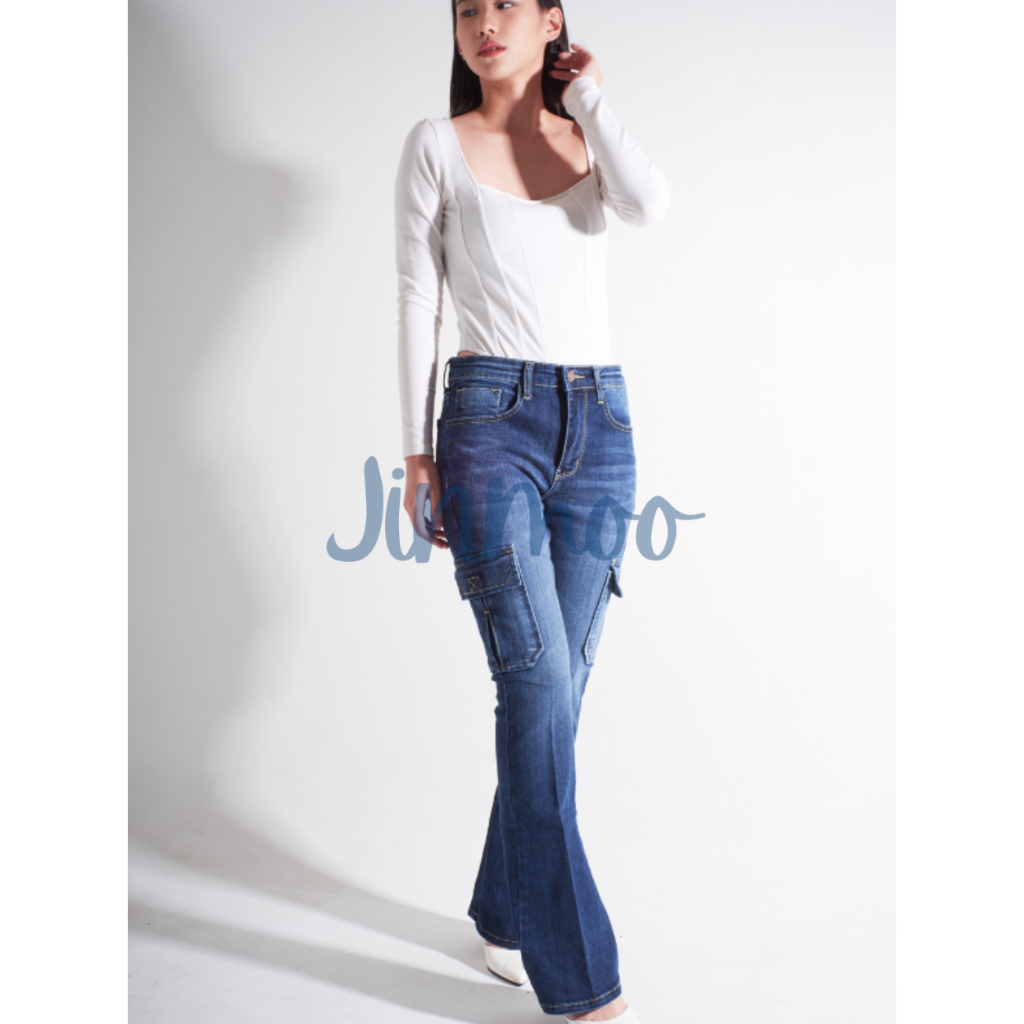 JINMOO BOOTCUT CARGO : Celana Jeans Stretch Cutbray Kargo Wanita
