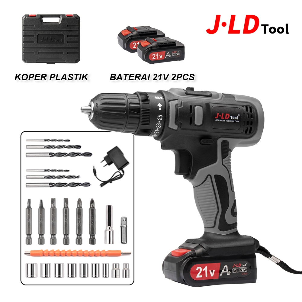 JLD 10mm Cordless mesin bor 21V baterai set bor cas mesin bor tangan listrik bor kayu bor tembok bor beton screw driver cordless hand drill variable speed