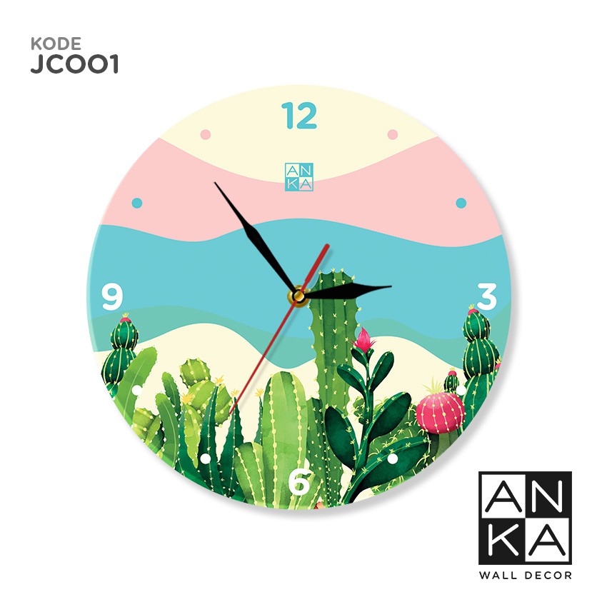 Jam Dinding Kayu Scandinavian Motif Bunga Kaktus Lucu Jam Custom Unik - JC001