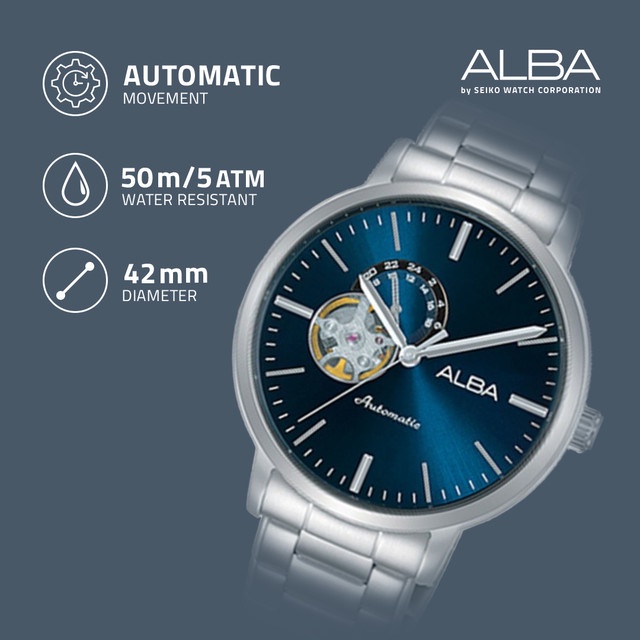 Alba Mechanical Jam Tangan Pria Open Heart A9A005 / A9A005X1 Automatic Dark Blue Navy Dial Stainless Steel Strap Watch