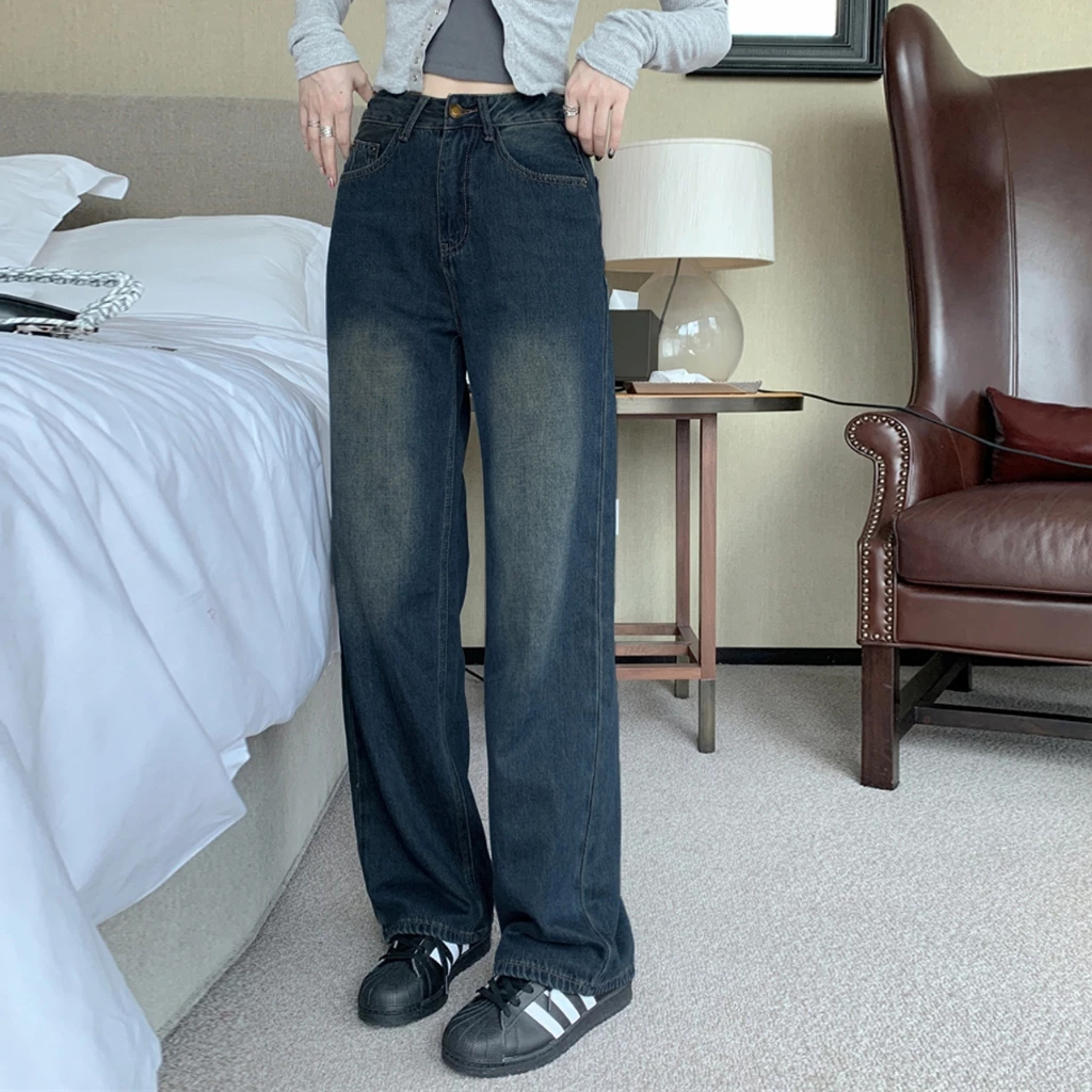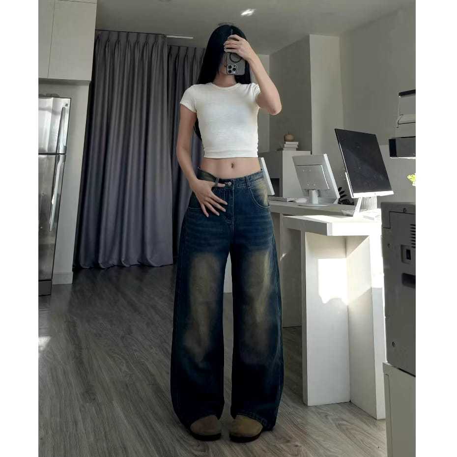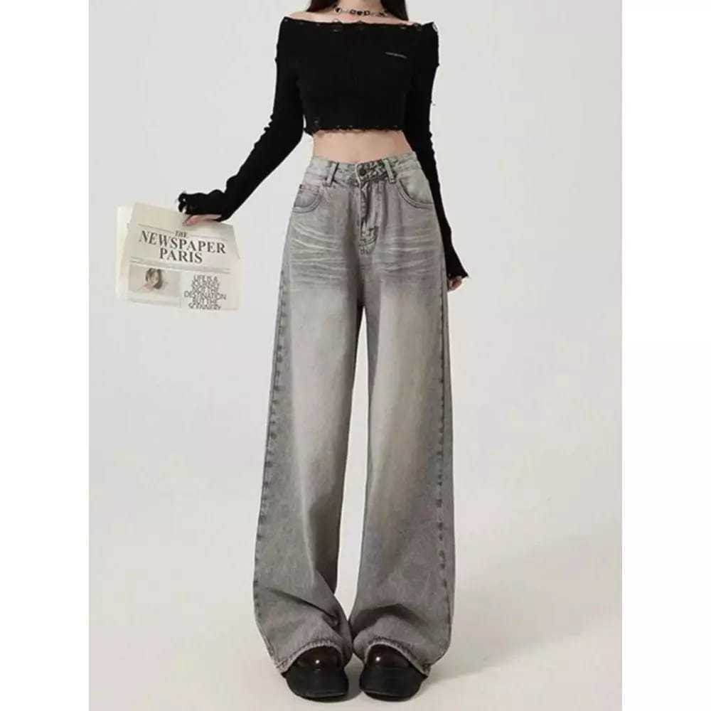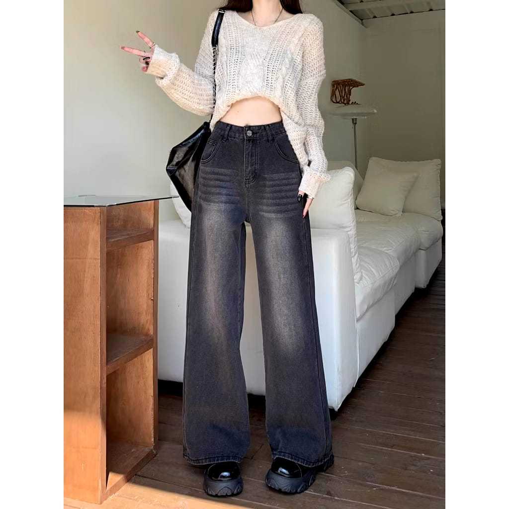 COD LULU Jeans Celana Jeans terbaru kulot Korea abu-abu retro pinggang tinggi--baggy jeans