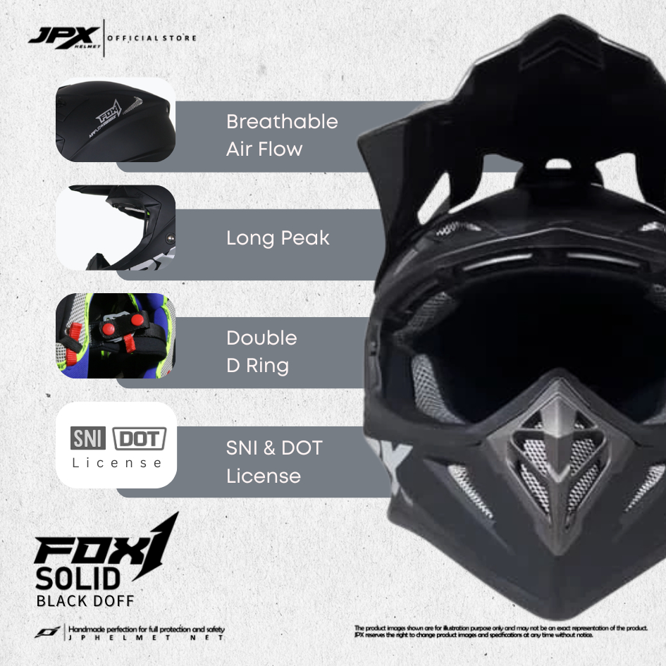 Helm Full Face Cross Pria Wanita Harian Motor Trail Tebal Nyaman SNI DOT JPX FOX1 Solid - Black Doff