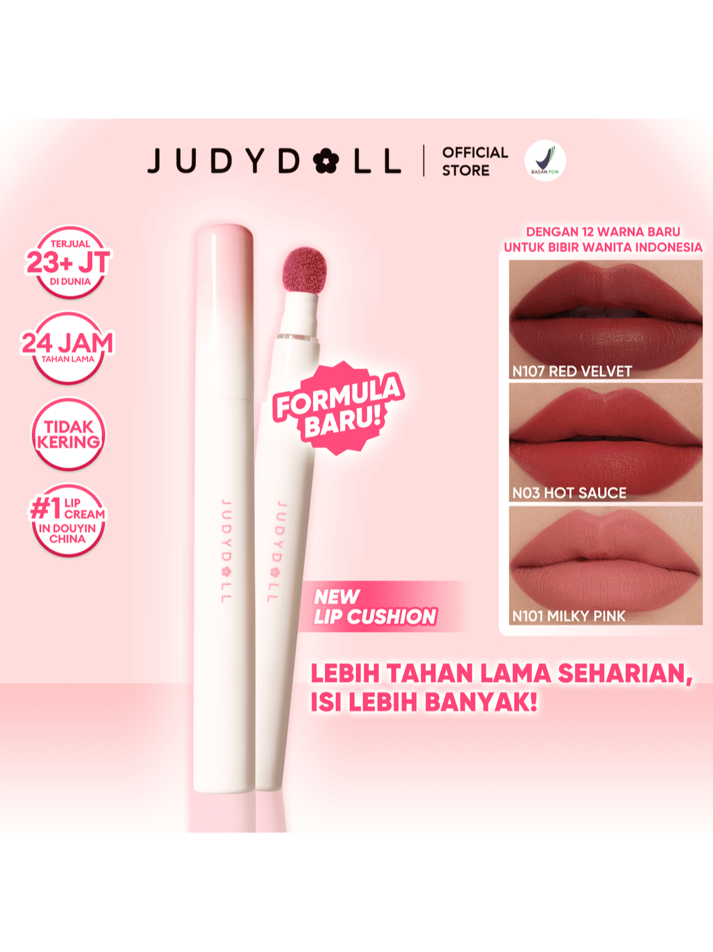 Judydoll NEW Lip Cushion Matte Lipcream - 2.4gr (Lipstick Super Nyaman, Tahan 12 Jam, Lipstik Dengan Hasil Ringan, Transferproof, Dengan Velvet Matte Finish)