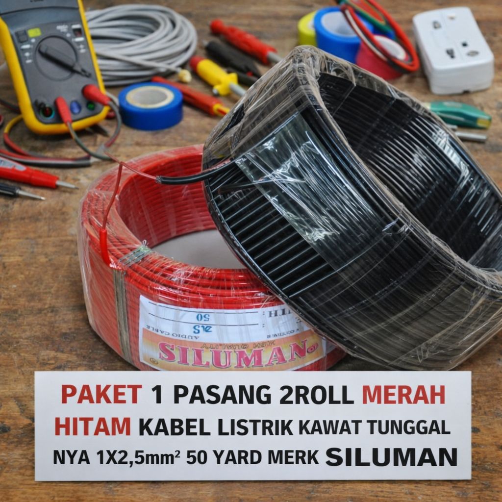 PAKET 1PASANG 2ROLL MERAH HITAM MERK SILUMAN KABEL LISTRIK TEMBAGA KAWAT TUNGGSAL ISI 1 KABEL LISTRIK NYA 1X2,5MM2 50 YARD