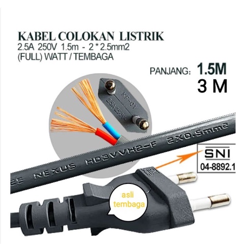 KABEL POWER /KABEL SNI AC 220V 1.5M/ KABEL BUNTUNG / KABEL LISTRIK Kabel Sambungan + Colokan Listrik