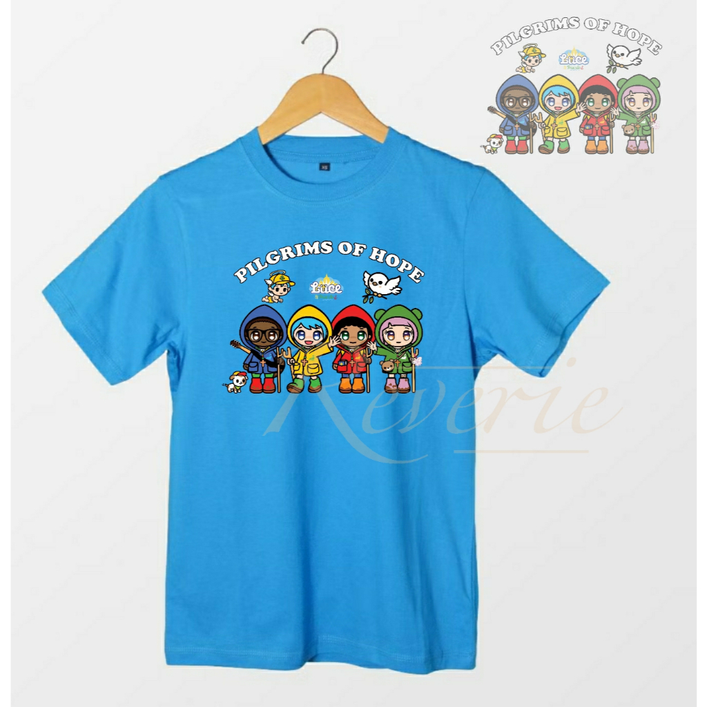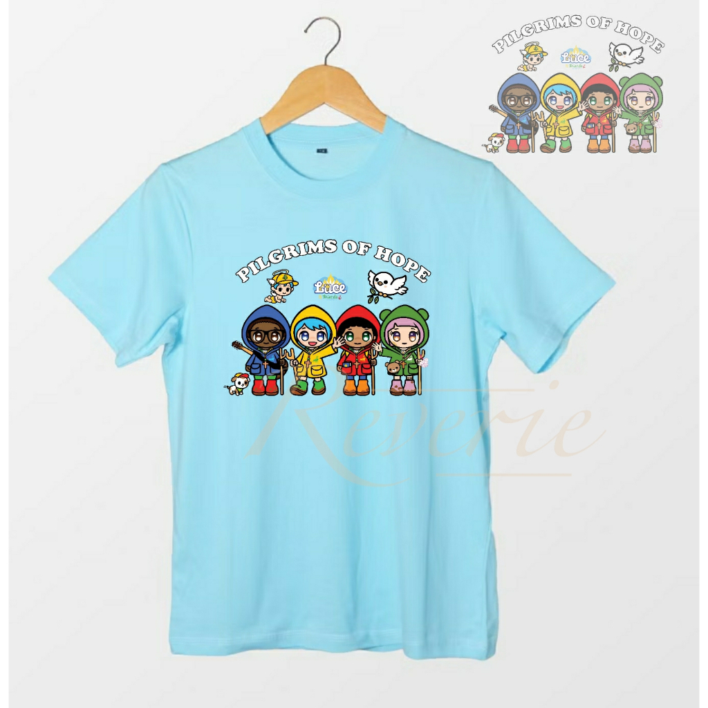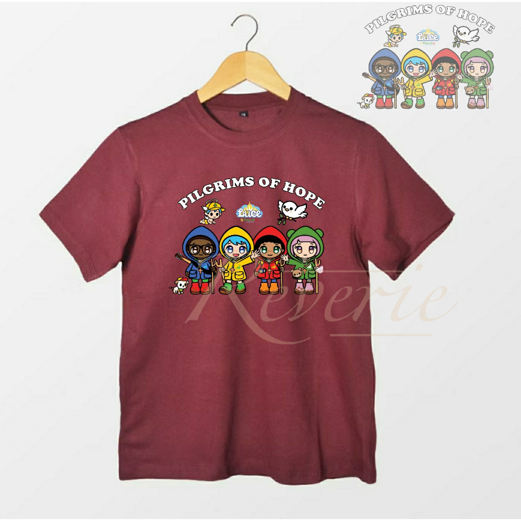 KAOS BAJU LUCE AND FRIENDS FULL TEAM PILGRIMS OF HOPE TSHIRT SERAGAM ACARA YUBILEUM 2025 YUBELIUM MASKOT VATIKAN PAROKI GEREJA KATEDRAL ZIARAH KATOLIK KRISTIANI DEWASA ANAK COUPLE OUTFIT