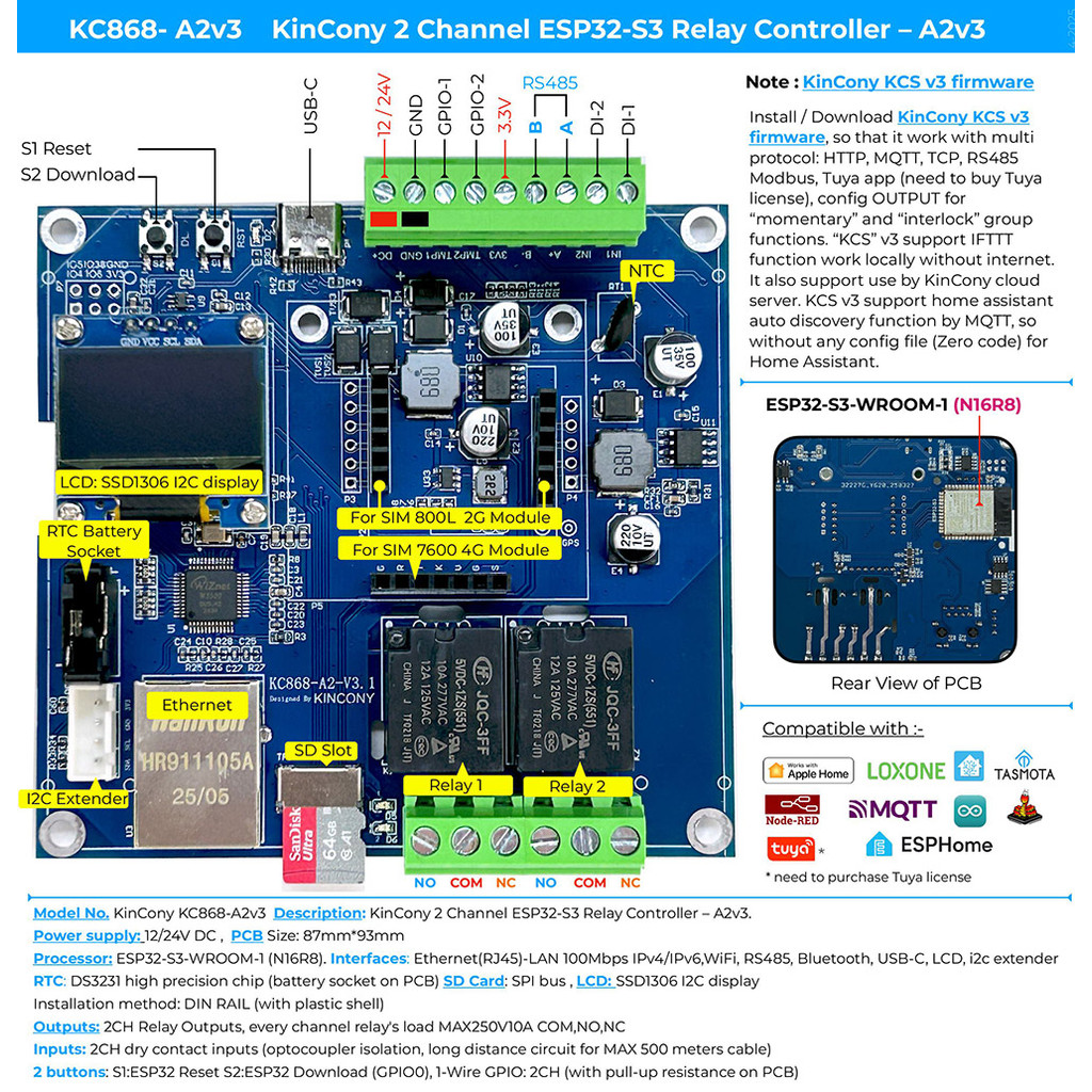 KC868-A2v3 ESP32-S3 2 Channel Relay Module ESPHome Home Assistant KCS v3 MQTT RS485 Modbus Smart Home DIY