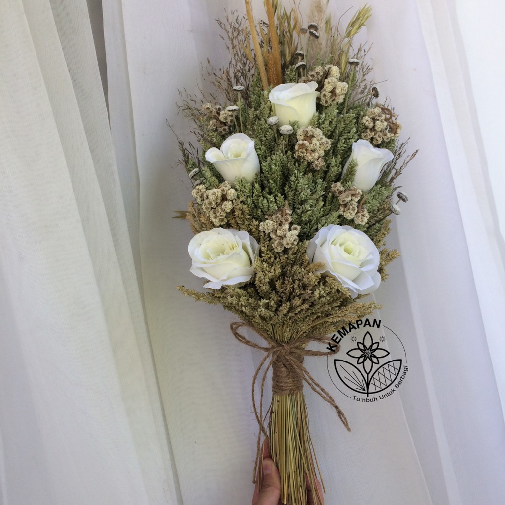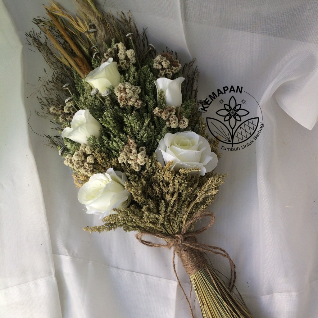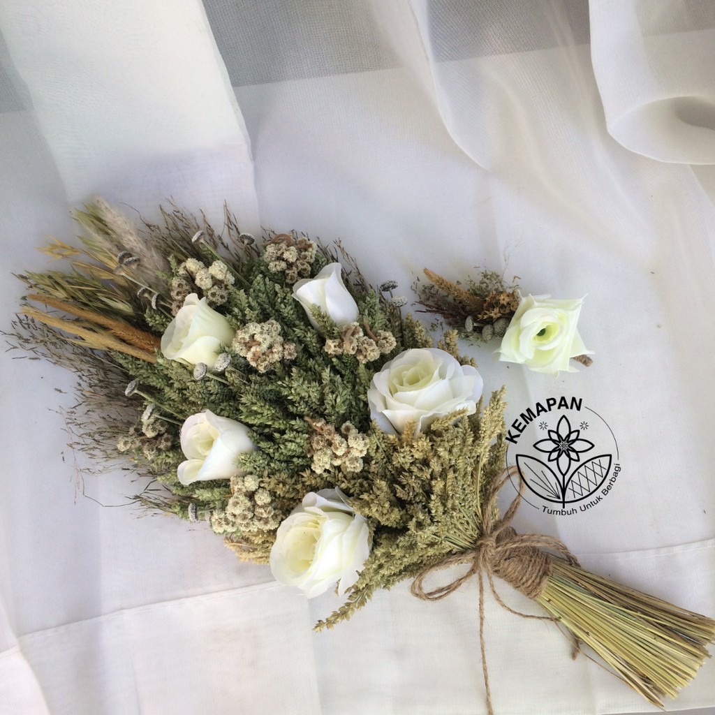 KEMAPAN Buket bunga kering mawar putih + corsage (bunga jas)
