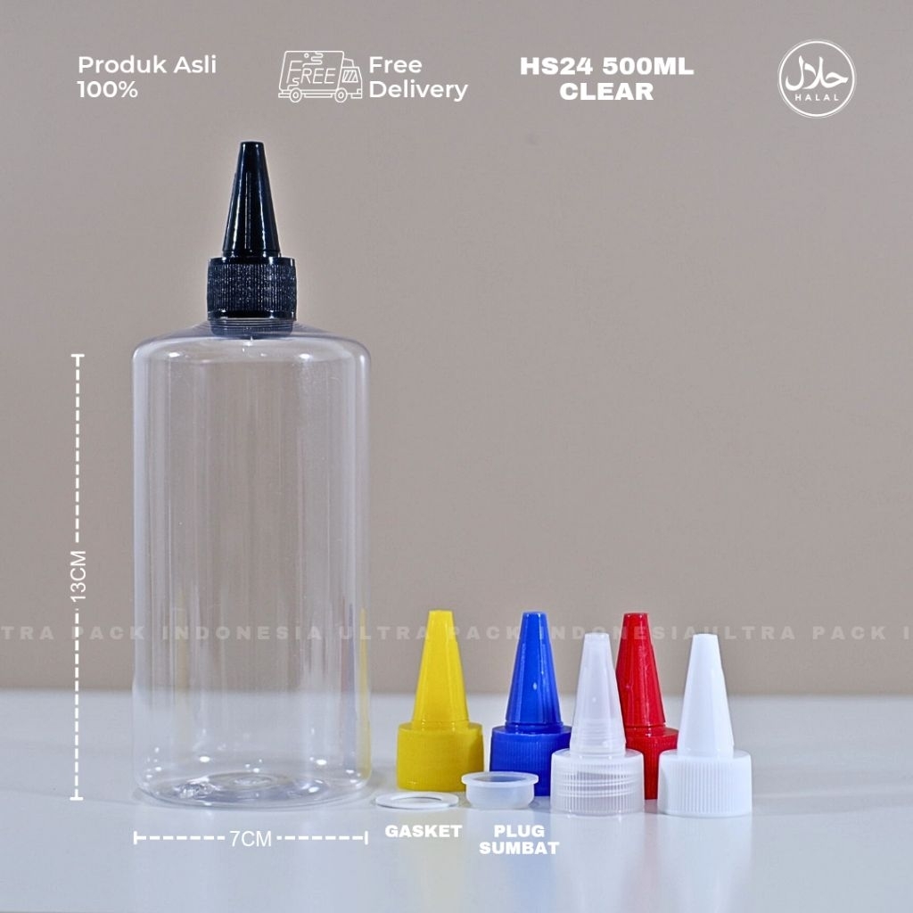 KEMASAN BOTOL TINTA ISI ULANG - BOTOL PET HS24 500ML CLEAR + TUTUP TINTA + GASKET LUBANG + TUTUP SUMBAT ANTI BOCOR