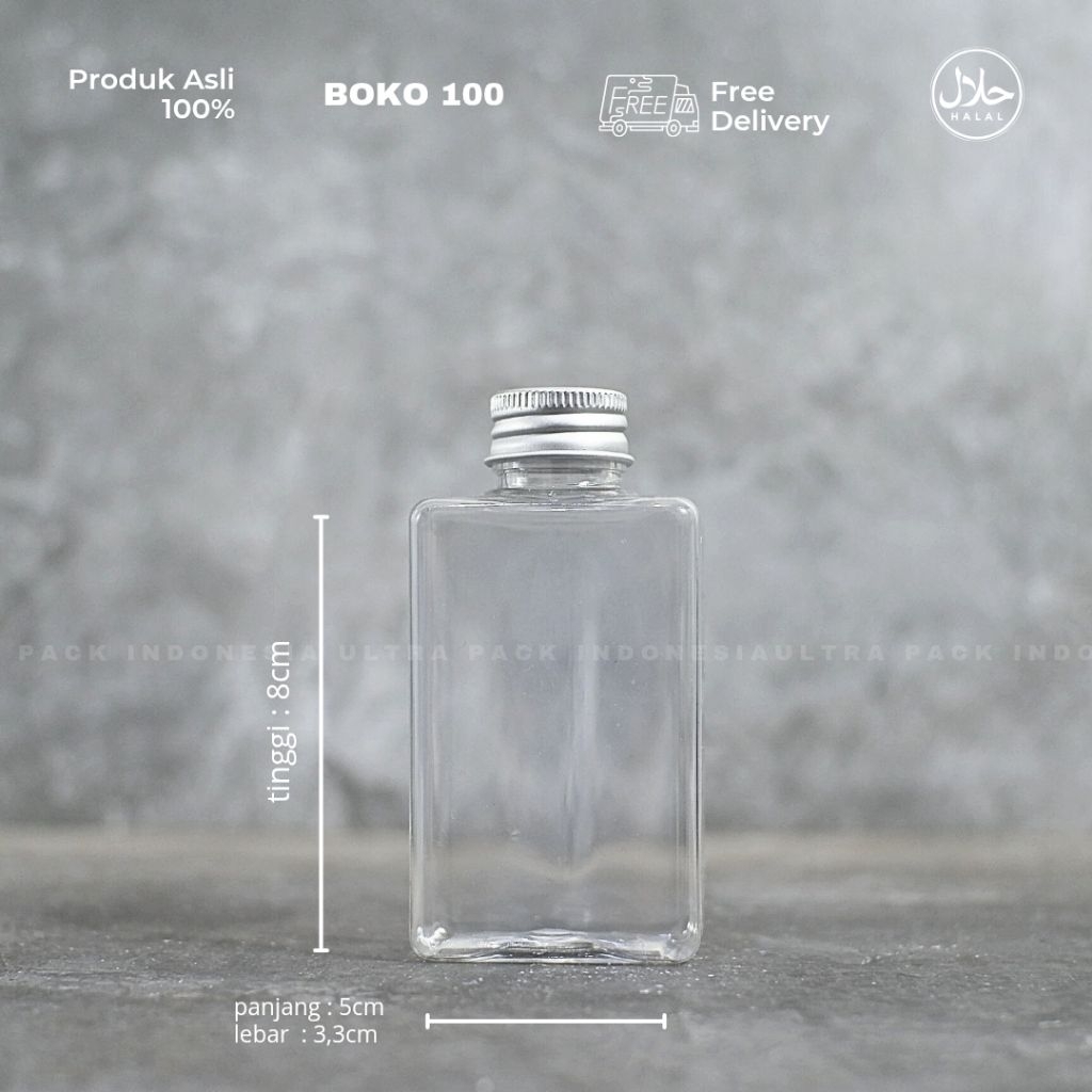 KEMASAN MINUMAN BOTOL FOOD GRADE - BOTOL PET BOKO KOTAK 100ML CLEAR + TUTUP ULIR ALUMINIUM