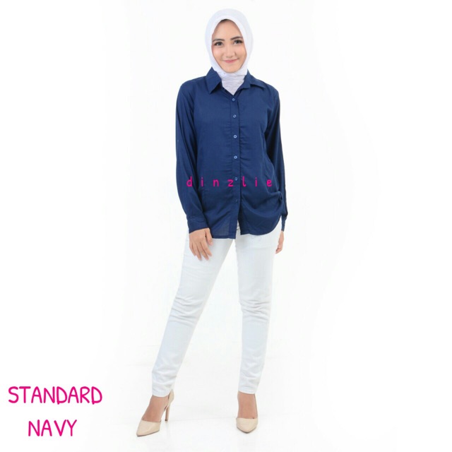 KEMEJA WANITA RAYON POLOSAN WARNA BIRU NAVY READY DARI UKURAN STANDARD LD 94CM SAMPAI XXXL LD 128CM