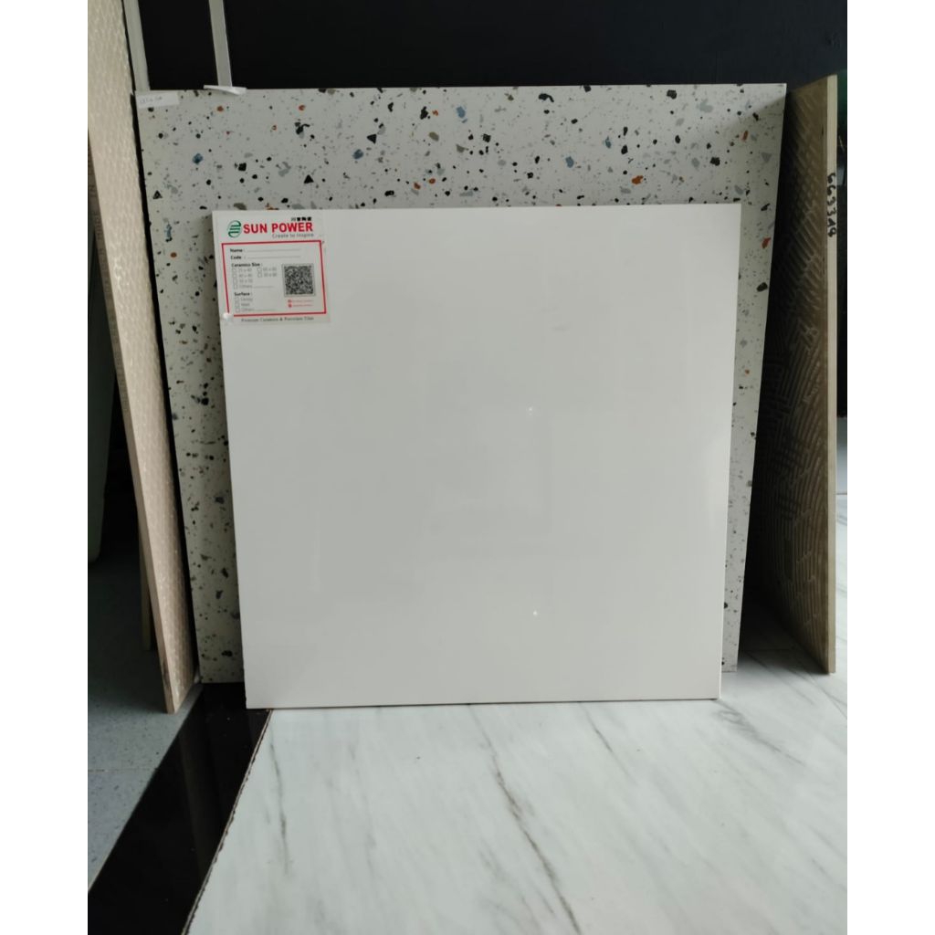 KERAMIK MERK SUNPOWER PUTIH POLOS UKURAN 50X50 PERMUKAAN TEKSTURE GLOSSY WHITE BODY RECTIFIED CUTTING SEMI GRANIT UNTUK LANTAI ATAU DINDING