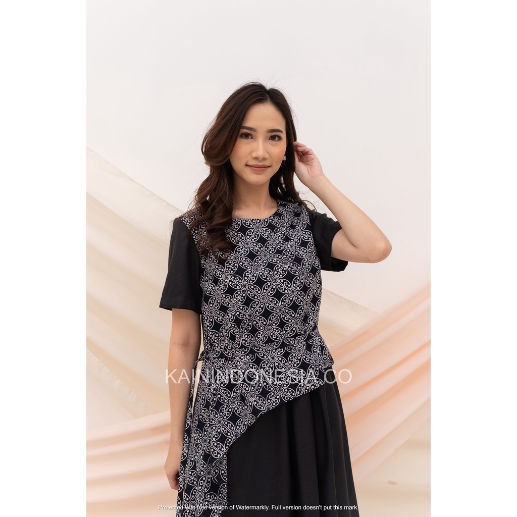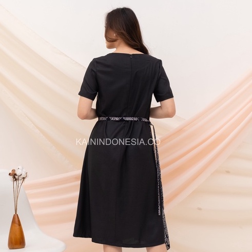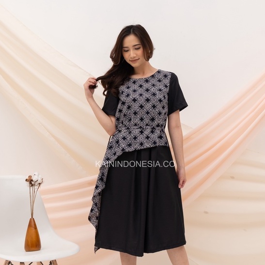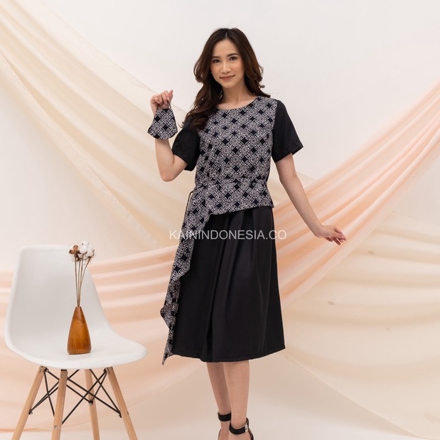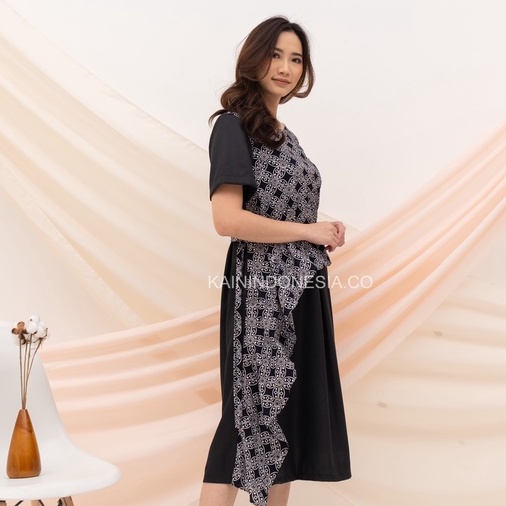 KI Dress Maya Batik Kombinasi Katun Kawung Hitam Modern