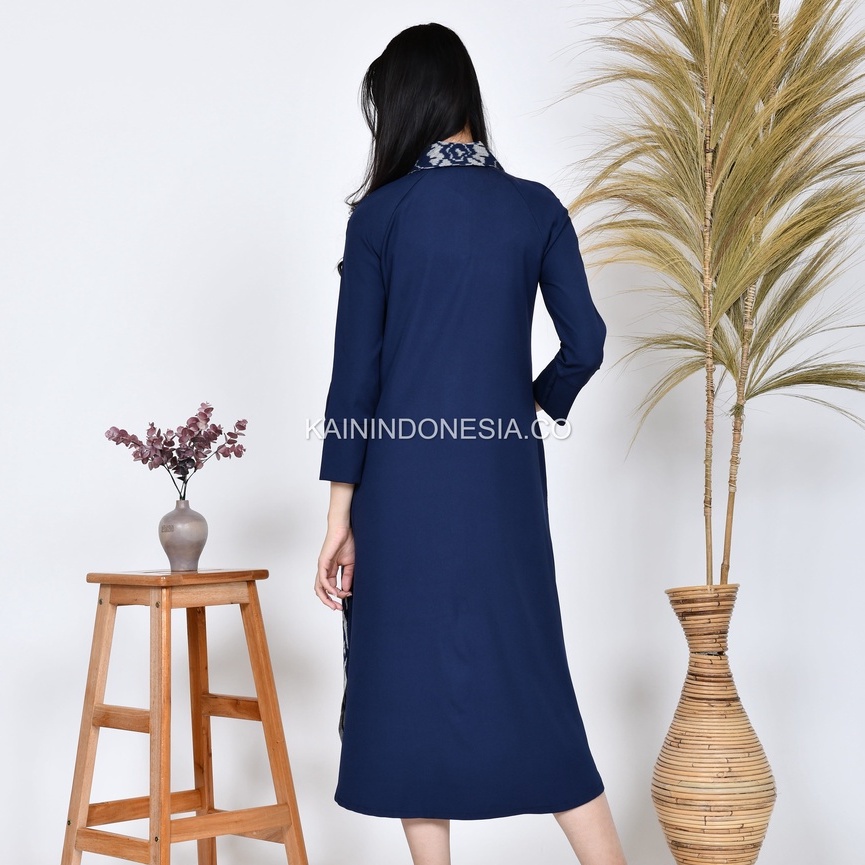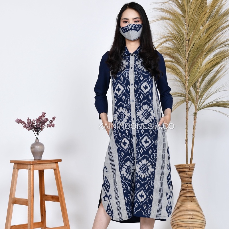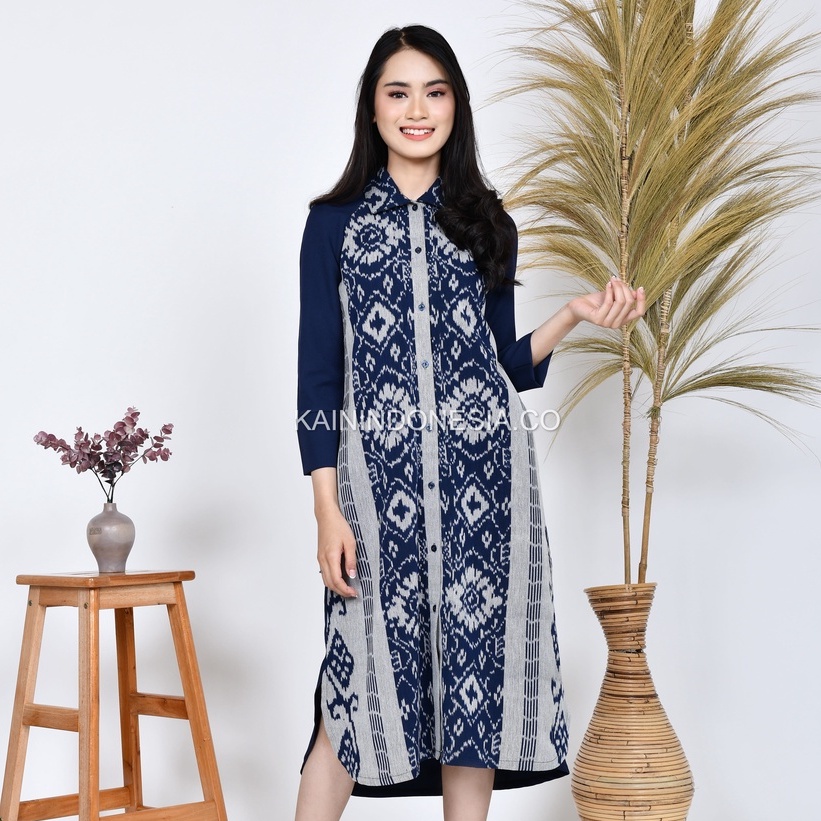 KI Kemeja Loose Panjang Tunik Dress Dayana Jumbo Tenun Asha Biru