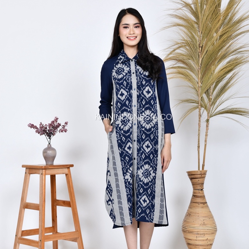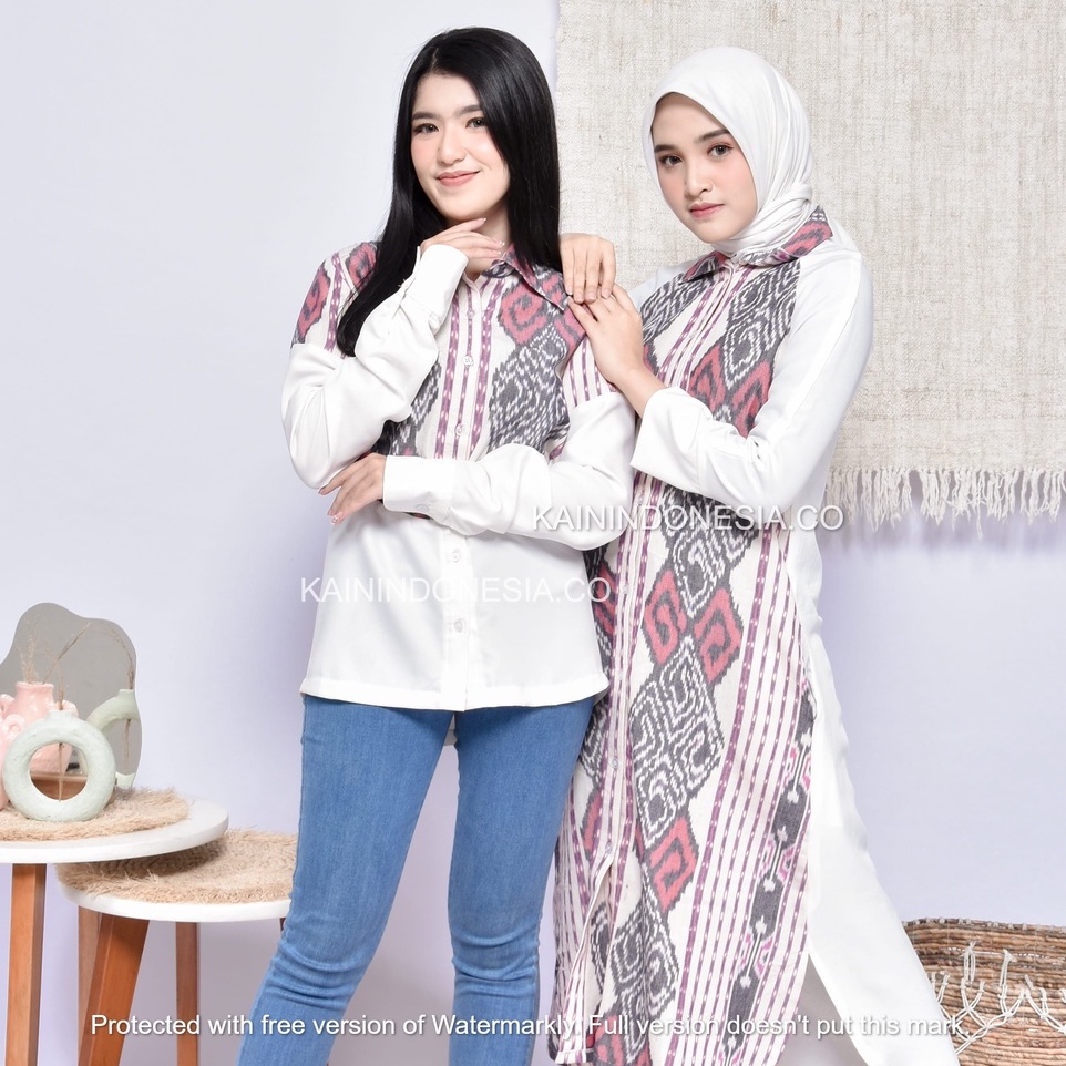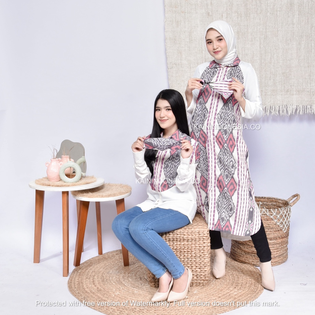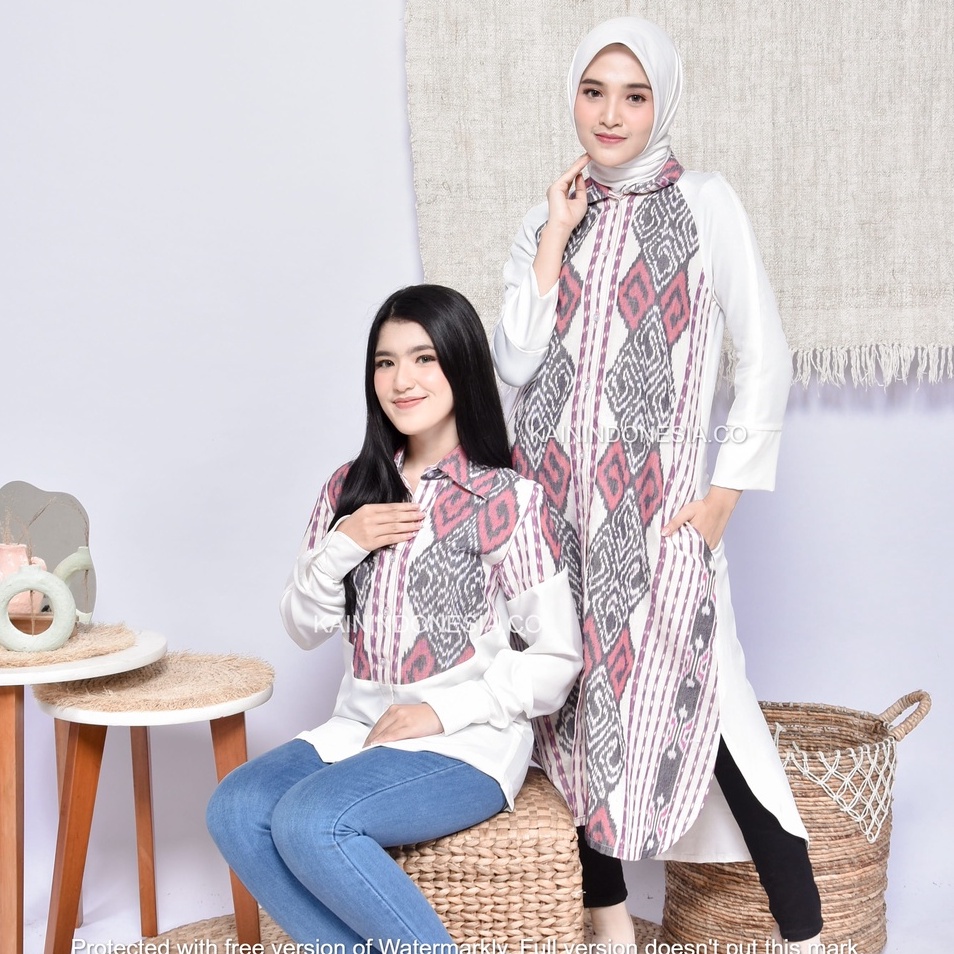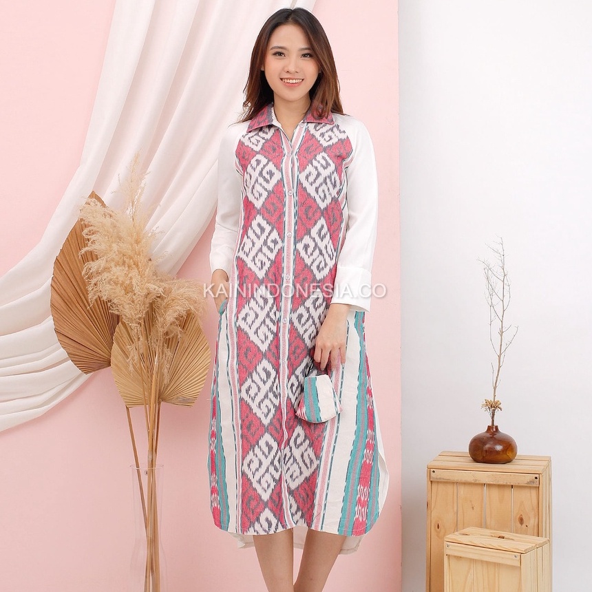 KI Kemeja Loose Panjang Tunik Dress Dayana Jumbo Tenun Lea Pink Hitam