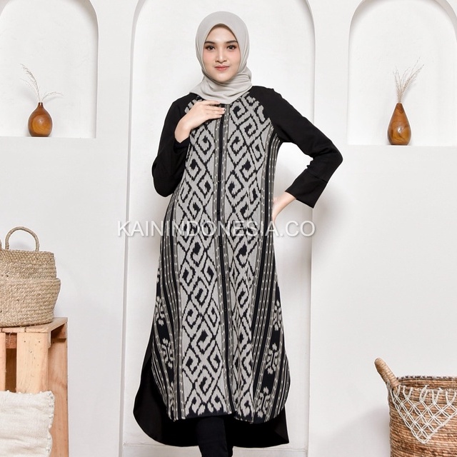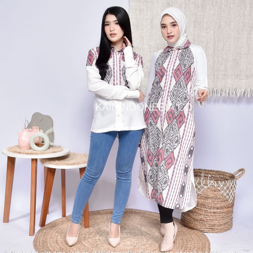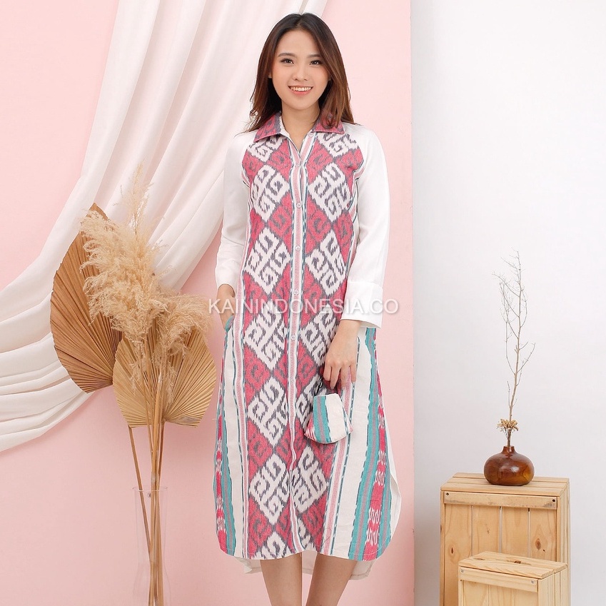 KI Kemeja Loose Panjang Tunik Dress Dayana Jumbo Tenun Liora Pink