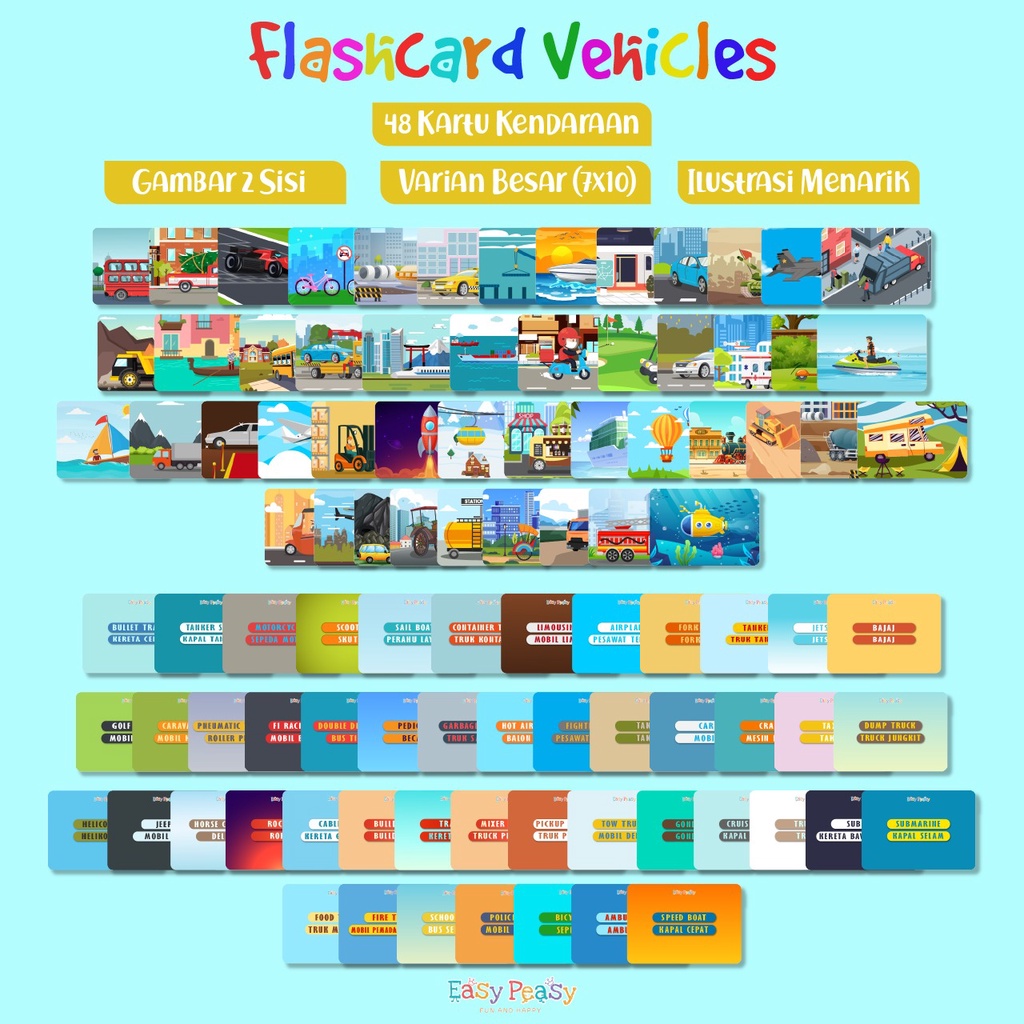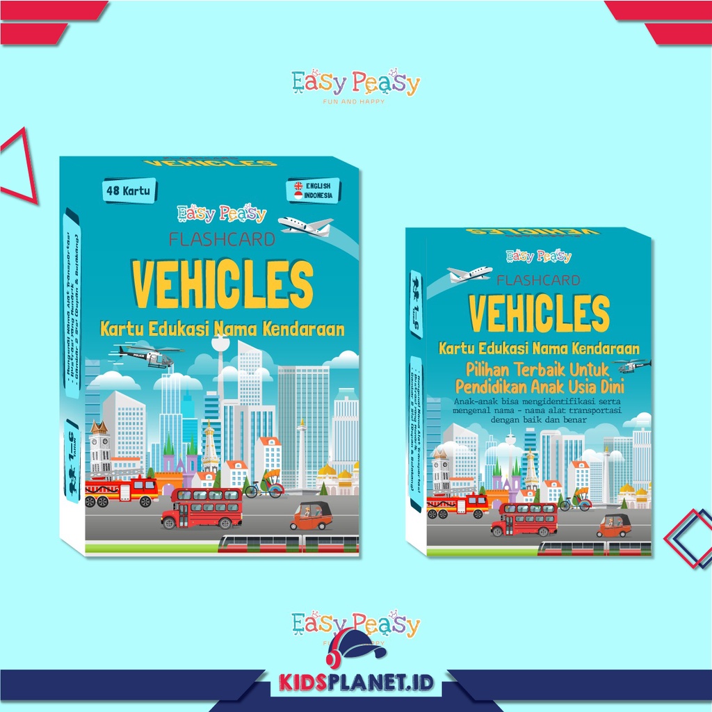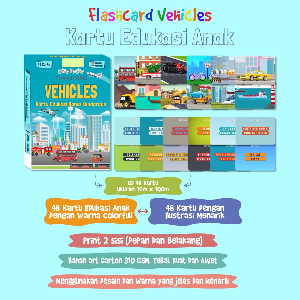KIDSPLANET | VEHICLES FLASHCARD - MAINAN KARTU FLASH CARD EDUKASI BELAJAR TENTANG KENDARAAN TRANSPORTASI VEHICLE ANGKUTAN UKURAN BESAR 7x10 CM ISI 48 KARTU BAHASA INGGRIS DAN INDONESIA