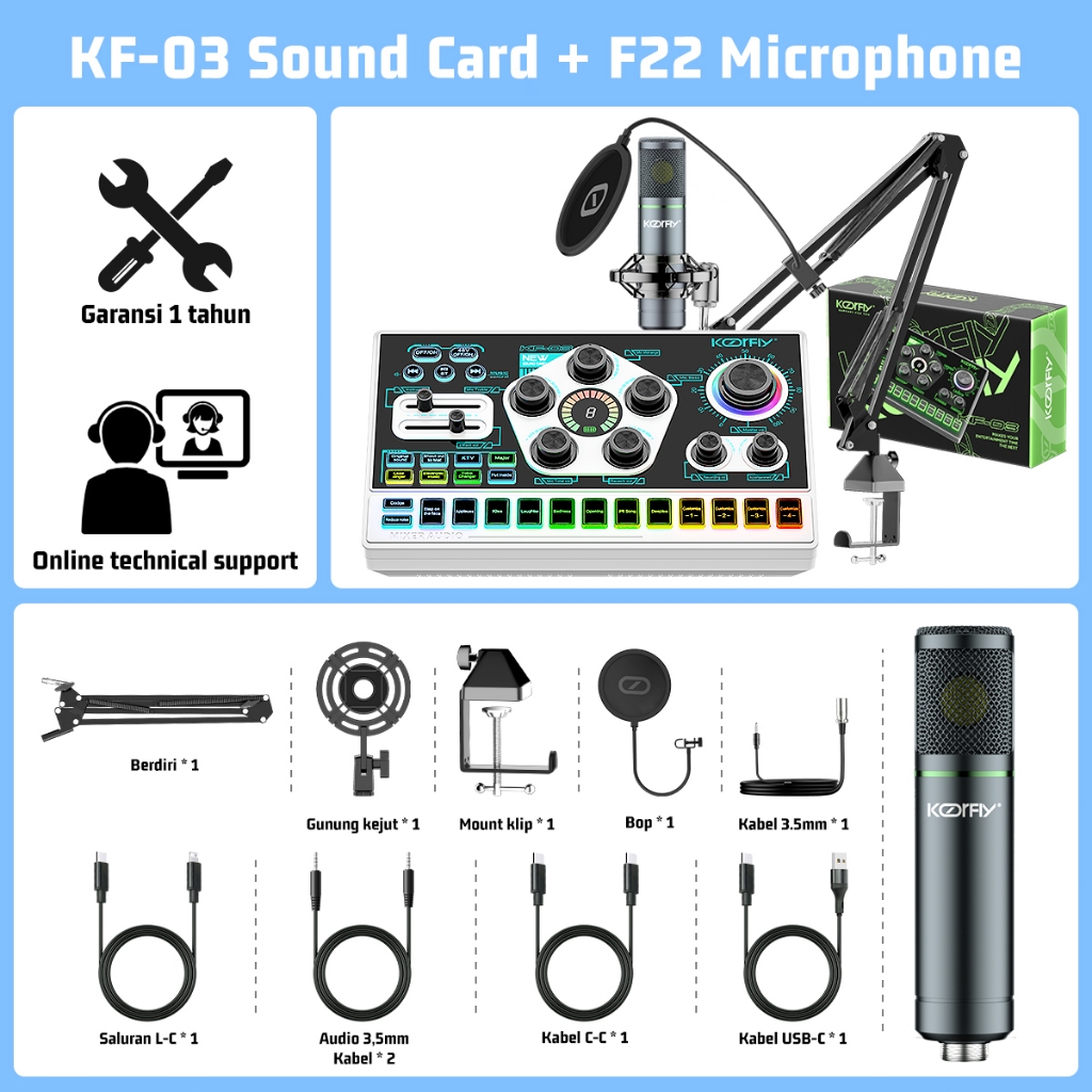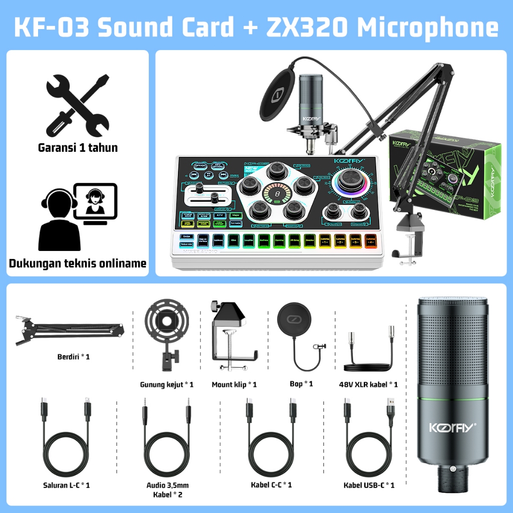 KOORFLY KF03 SoundCard 48V cahaya RGB mic Mixer Bluetooth sound card Pengurangan Kebisingan for Streaming Langsung karaoke Siap