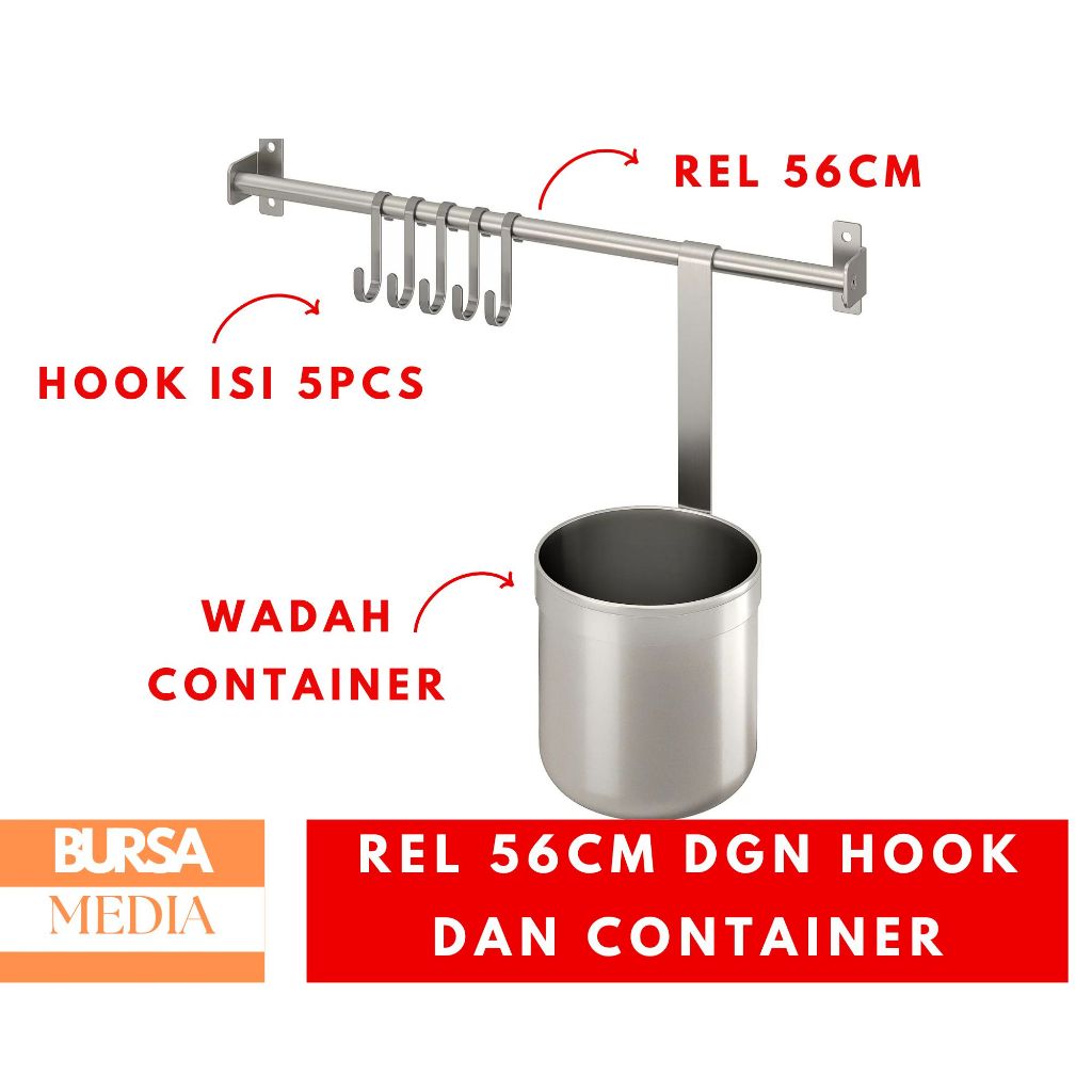 KUNGFORS Rel Dinding Dengan 5 Kait Dan 1 Wadah Stainless Steel Wall Rail + S - Hook + Container Organiser Dinding Dapur Wall Organizer IKKU50442