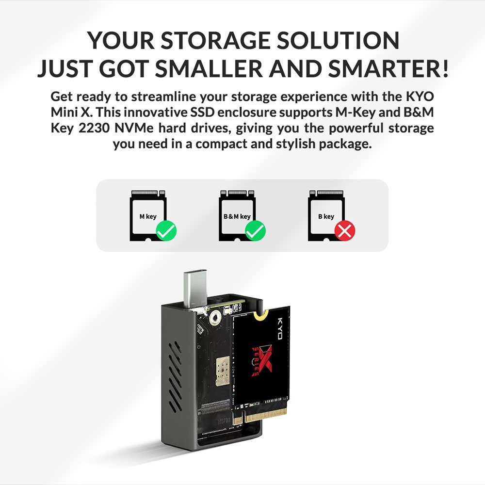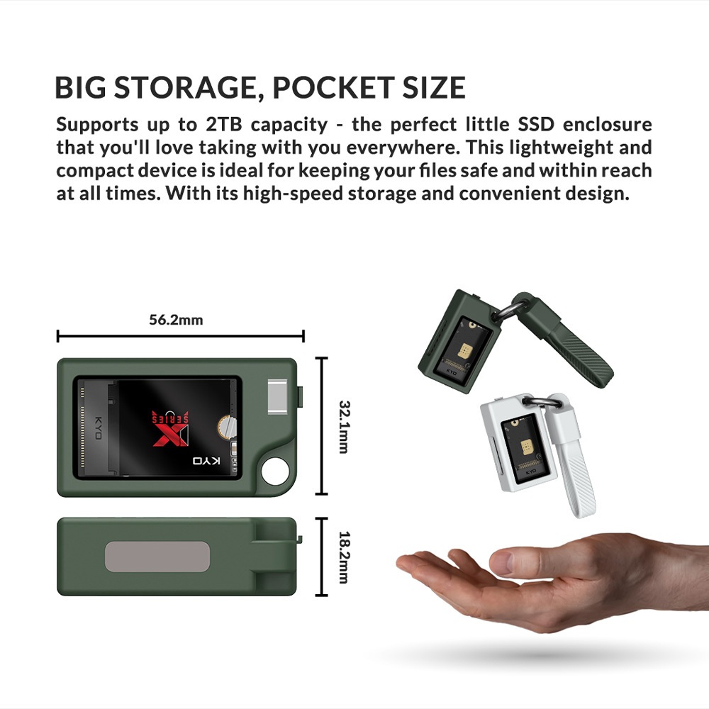 KYO Mini X 10Gbps Portable SSD Enclosure With Active Cooling Fan M.2 NVMe 2230 for iPhone Laptop PS5 Camera ROG Ally Handled gaming USB C 3.2 Gen2 10Gbps With Active Cooling Fan 128GB 256GB 512GB 1TB 2TB