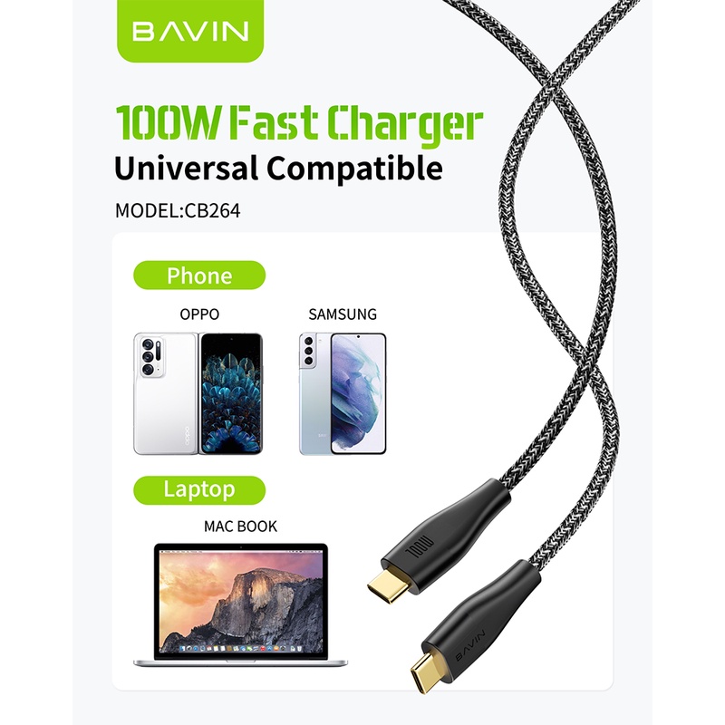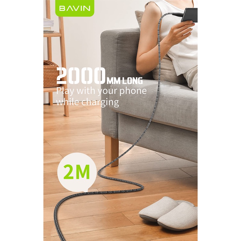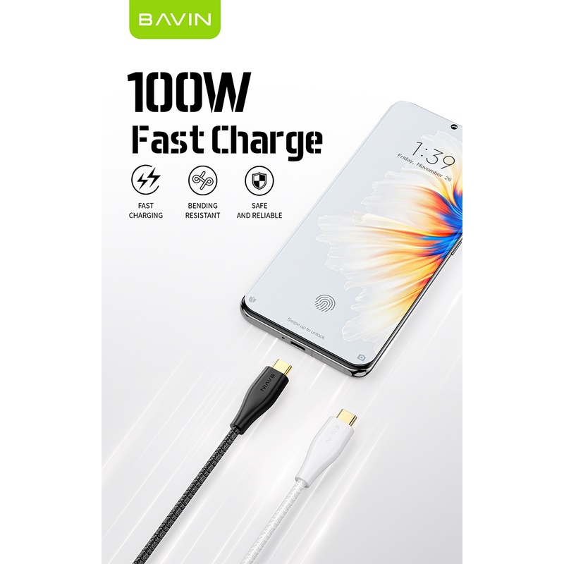 Kabel Charger 100W Double Type-C to Type-C PD 2 Meter Super Ultra Fast Charging Nylon Braided Data Cable BAVIN