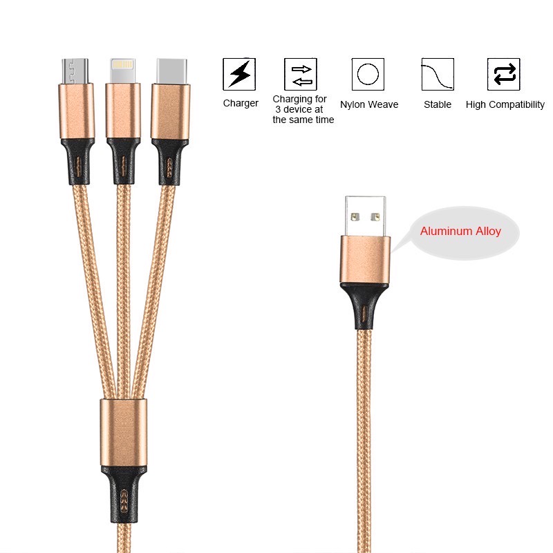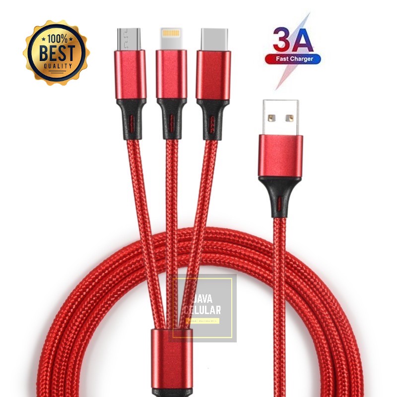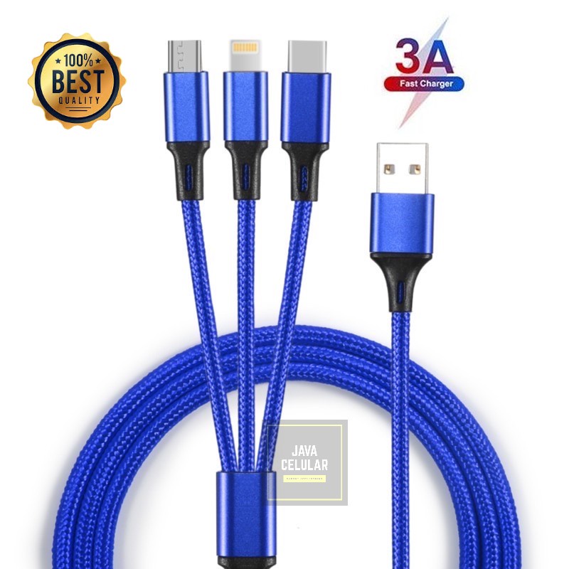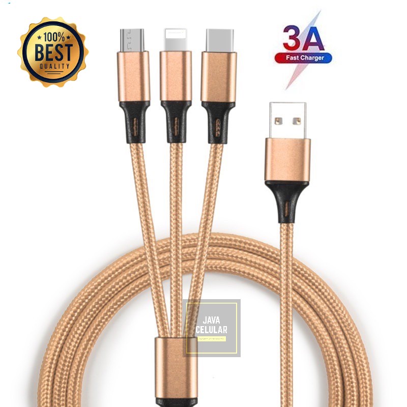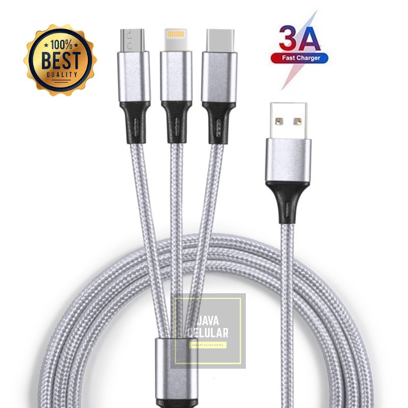 Kabel Charger 3 in 1 Micro USB Type C Lighning 3A Fast Charging 1.2M Nylon Braided Cable