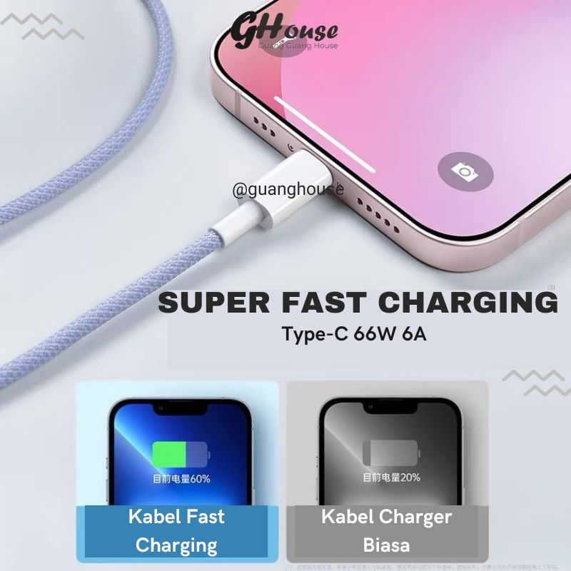 Kabel Charger USB Type-C 66W 6A Bahan Nilon Braided Kabel Data Type-C to C Kabel Super Fast Charging